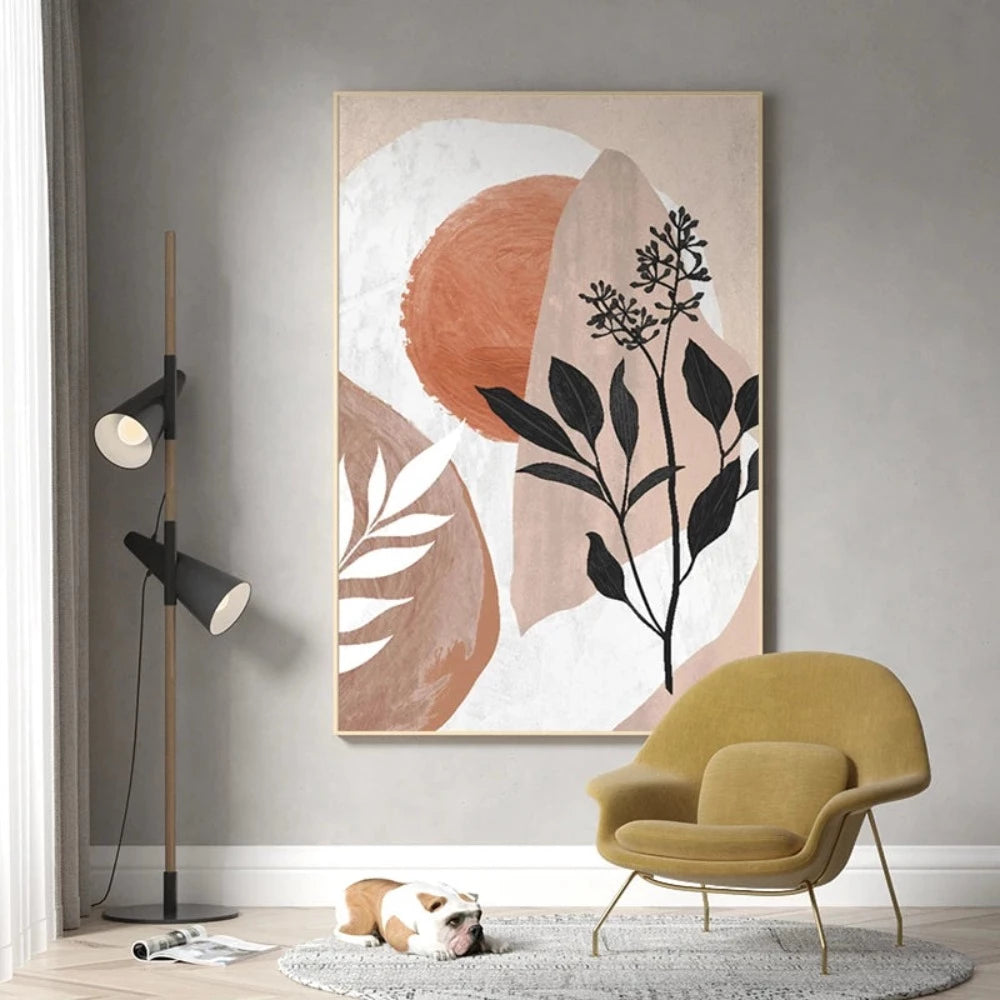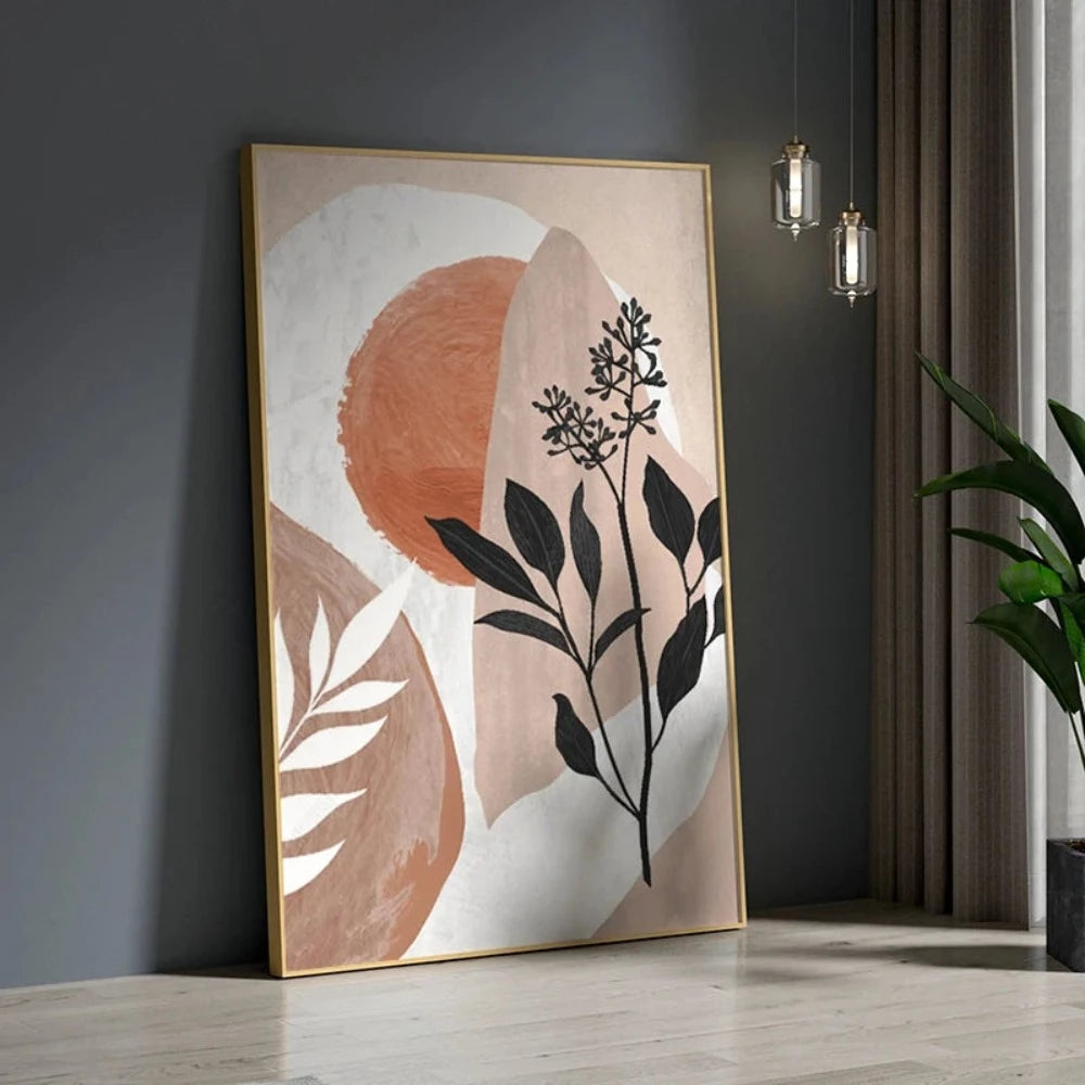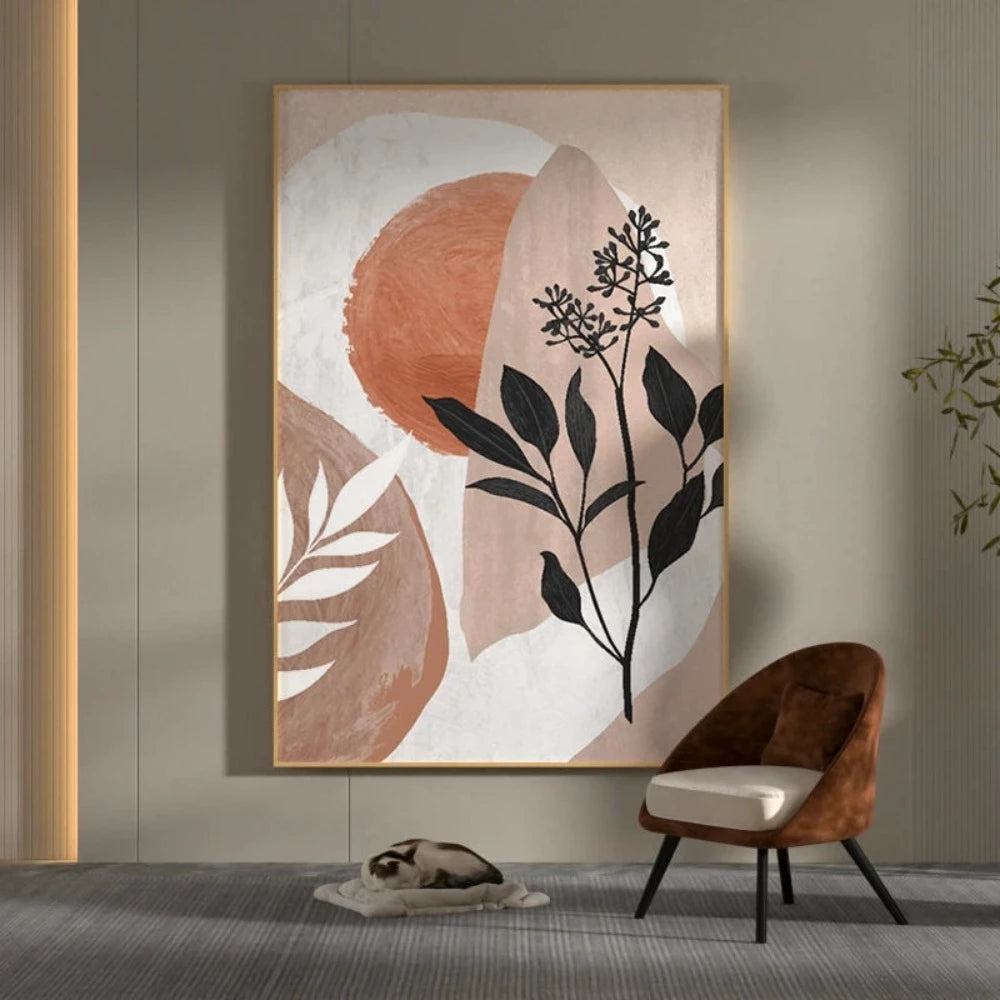 Nature’s calm, redefined. This minimalist hand-painted artwork combines organic botanical forms with warm terracotta, beige, and soft neutral tones. The bold black silhouettes of leaves create a striking contrast against gentle earthy shades, infusing any room with balance and natural elegance. Perfect for Scandinavian, boho, or modern interiors.