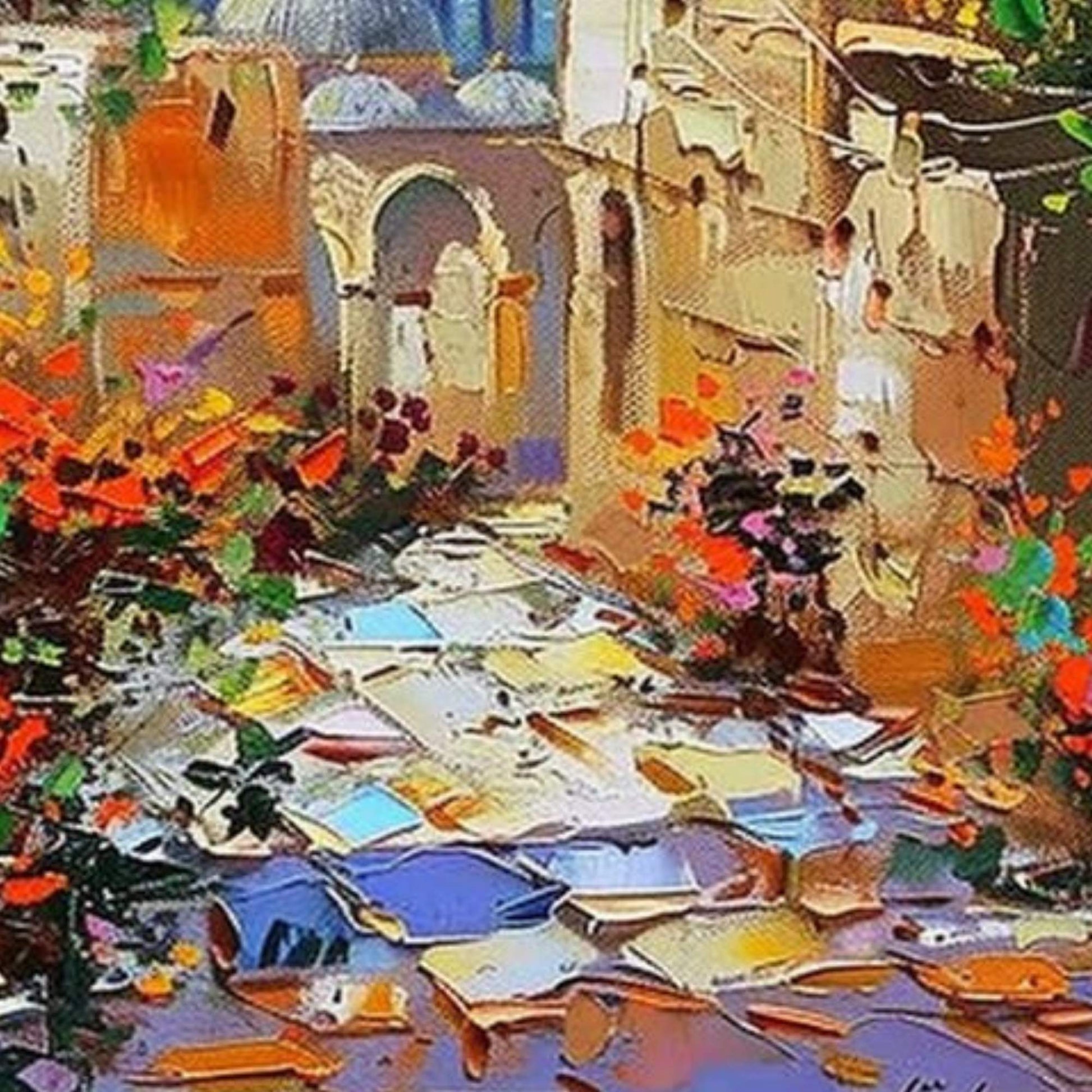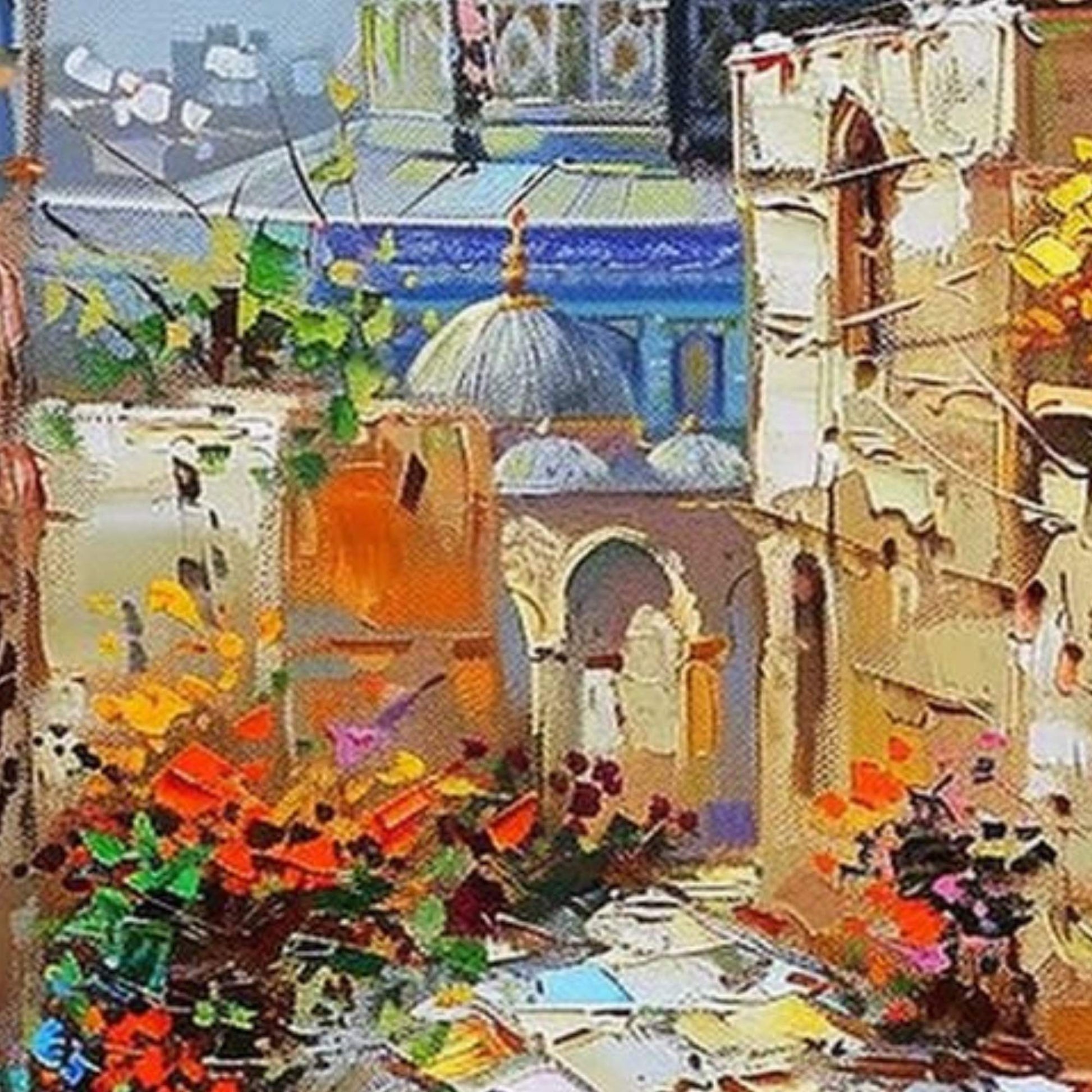 Golden dome rising above a serene Islamic skyline beneath a radiant sky. This breathtaking Arabic mosque skyline hand-painted oil painting captures the spiritual beauty of sacred architecture through luminous colour, expressive texture, and dynamic palette-knife brushwork. A majestic golden dome dominates the horizon, surrounded by elegant minarets, sunlit stone buildings, and vibrant foliage drifting through the air. The layered strokes, shimmering highlights, and warm reflections create depth, movement, and a tranquil yet powerful atmosphere. Each artwork is entirely hand-painted, making every piece a unique and expressive masterpiece.
