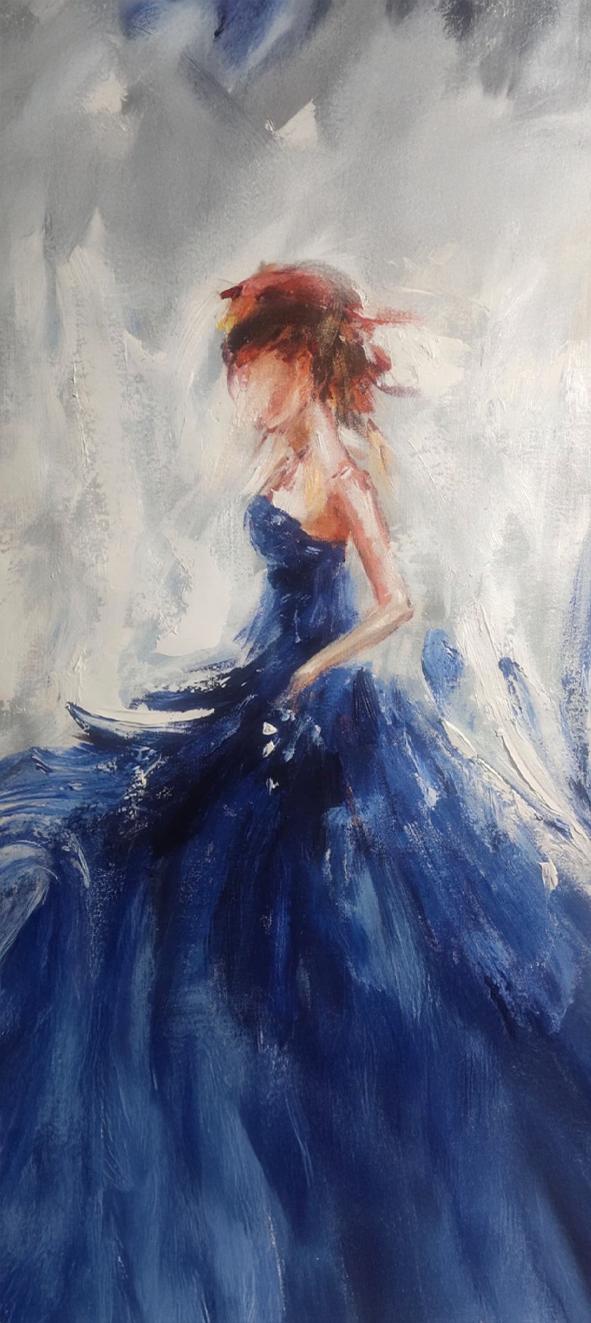 Radiating elegance and motion, this abstract figurative painting captures a woman in a flowing blue gown with sweeping brushwork and textured impasto detail. The expressive strokes of cobalt, navy, and white contrast with warm highlights in the figure’s skin and hair, creating depth and fluidity. Ideal for dressing rooms, bedrooms, or any space that celebrates fashion, grace, or dynamic femininity, this hand-painted canvas makes a bold visual statement with modern romantic flair.