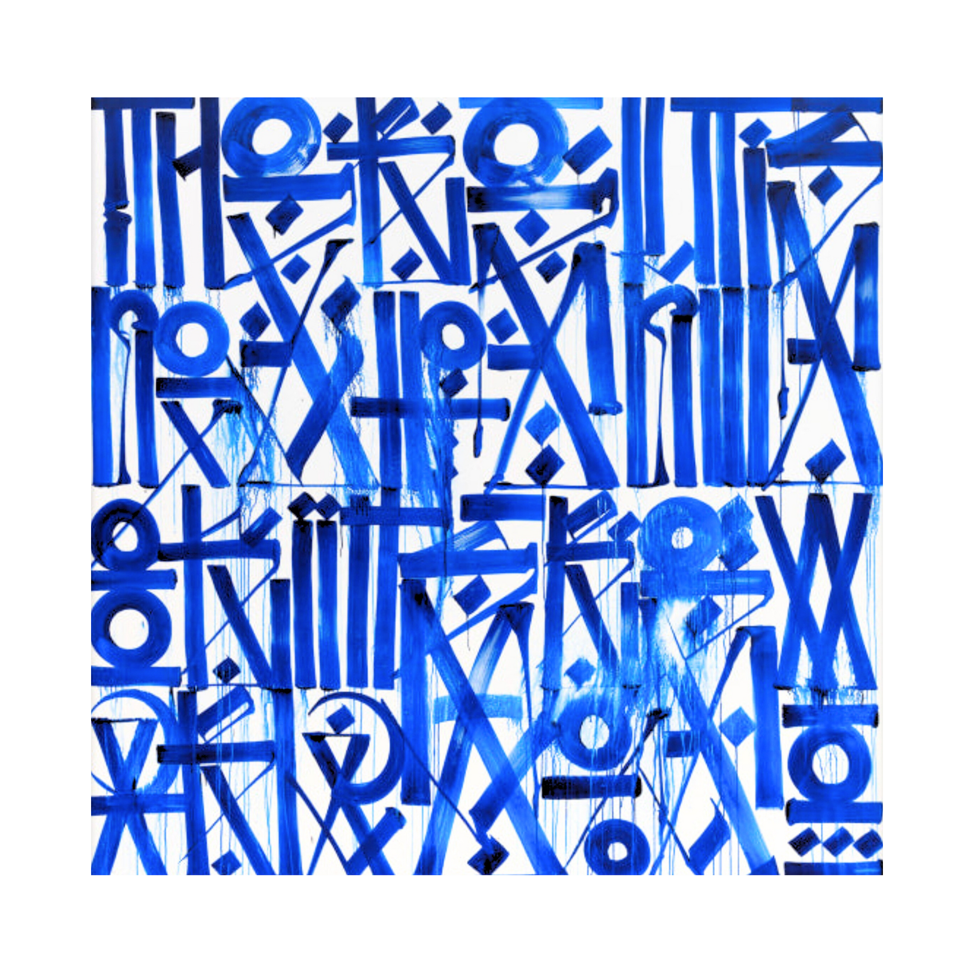 A striking homage to contemporary graffiti artistry. This Retna-inspired painting features bold cobalt blue calligraphic forms layered over a crisp white background. The intricate, abstract letterforms create a rhythmic pattern, blending street art energy with fine art precision. Hand-painted on premium canvas, the piece radiates urban sophistication and makes an unforgettable statement in any space.