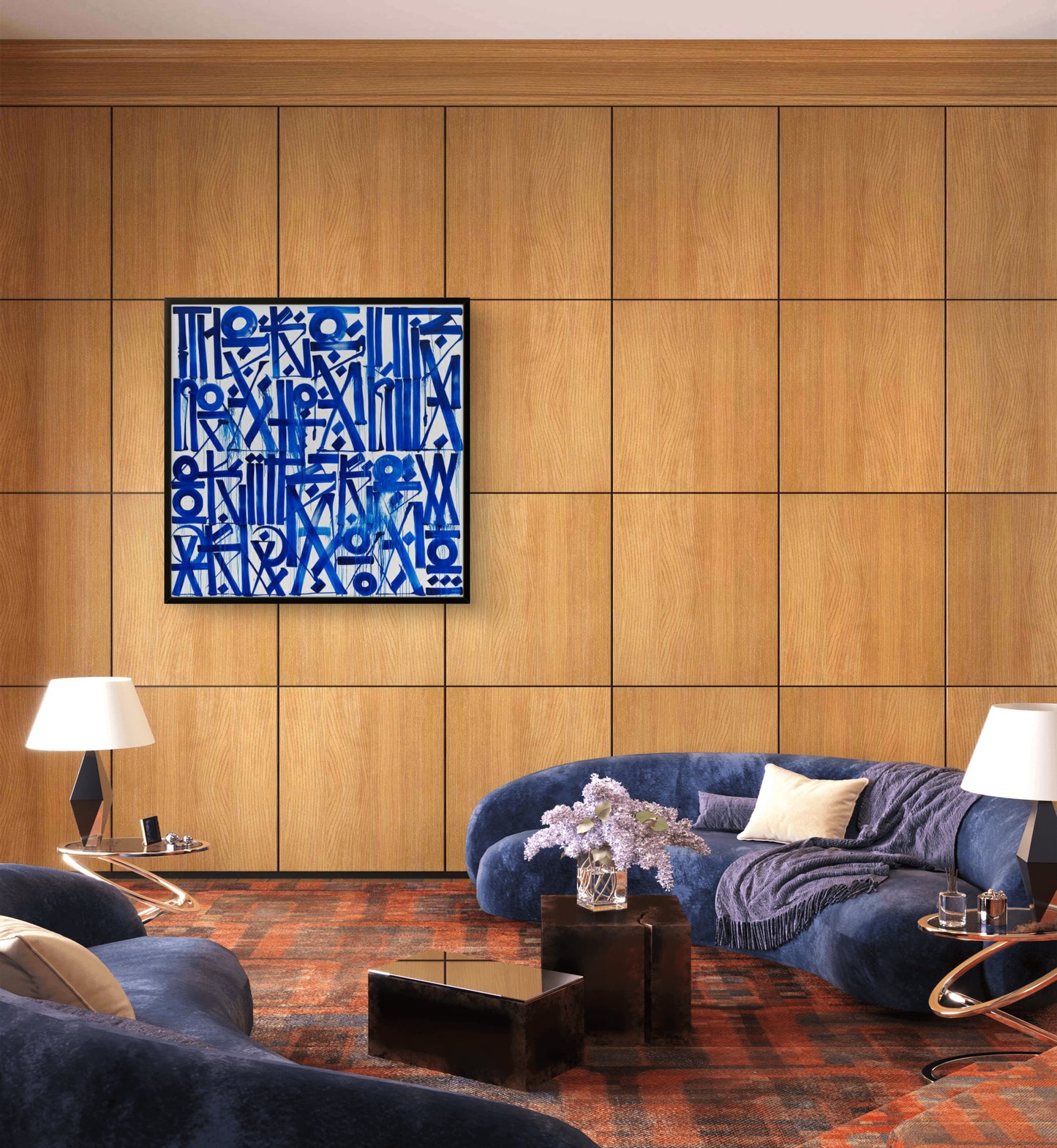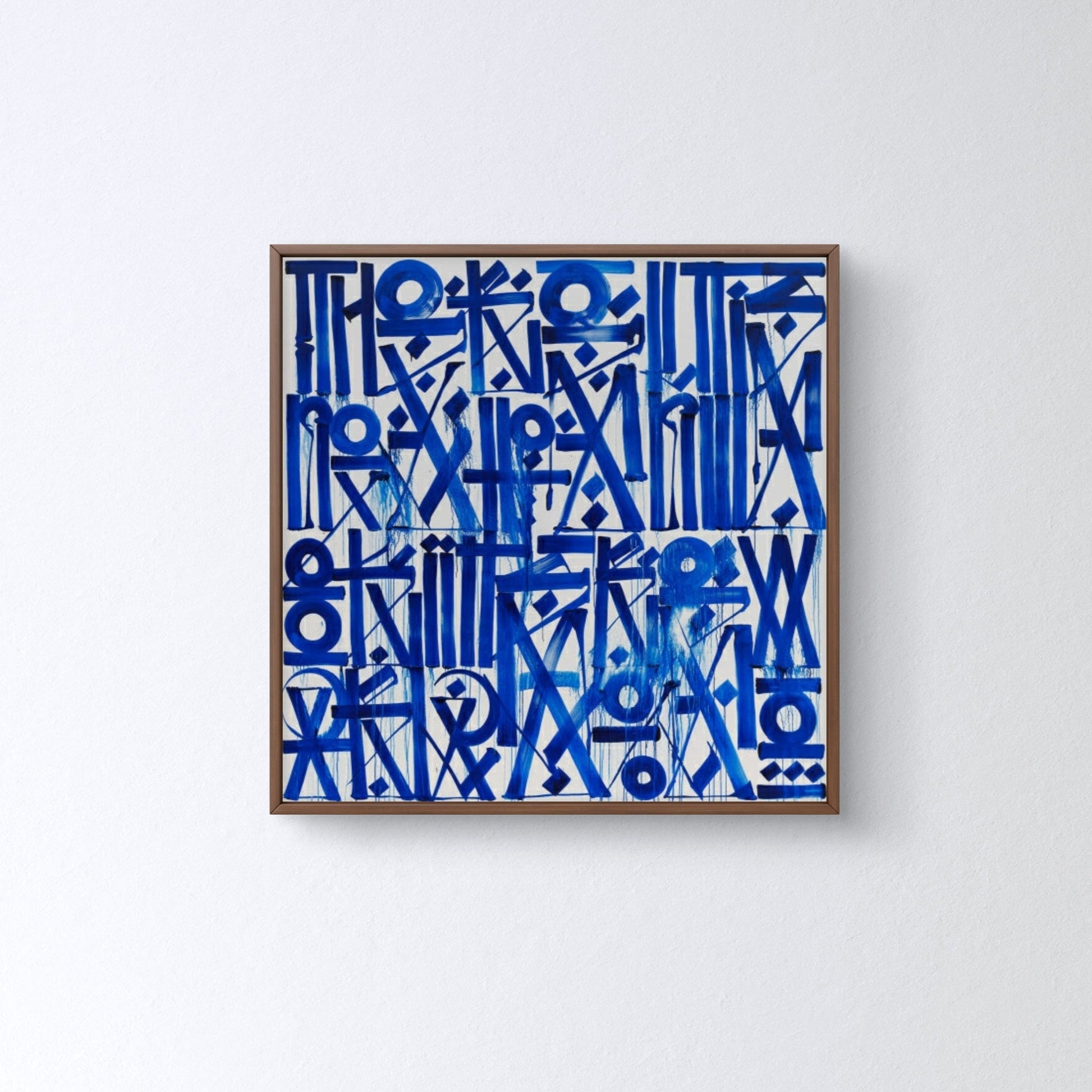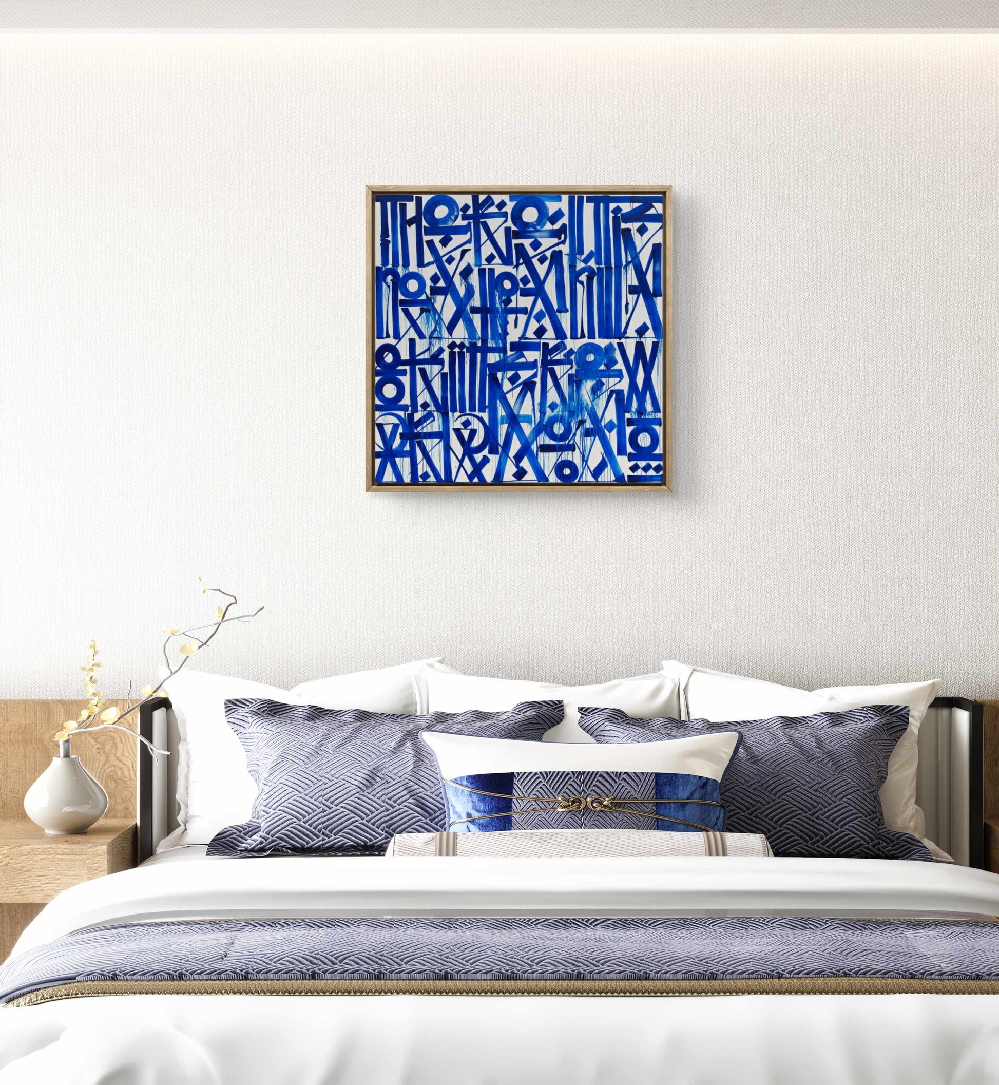 A striking homage to contemporary graffiti artistry. This Retna-inspired painting features bold cobalt blue calligraphic forms layered over a crisp white background. The intricate, abstract letterforms create a rhythmic pattern, blending street art energy with fine art precision. Hand-painted on premium canvas, the piece radiates urban sophistication and makes an unforgettable statement in any space.