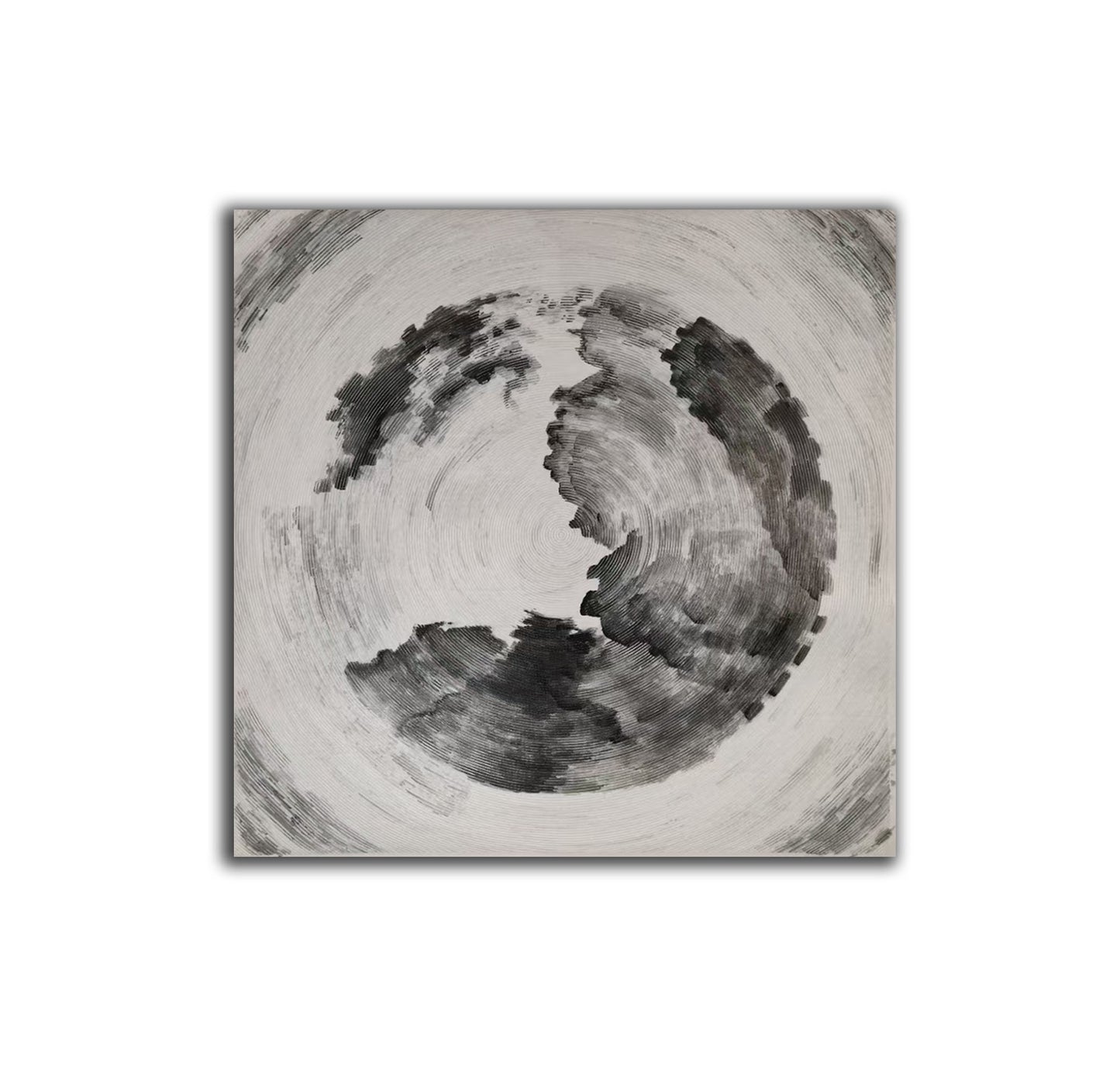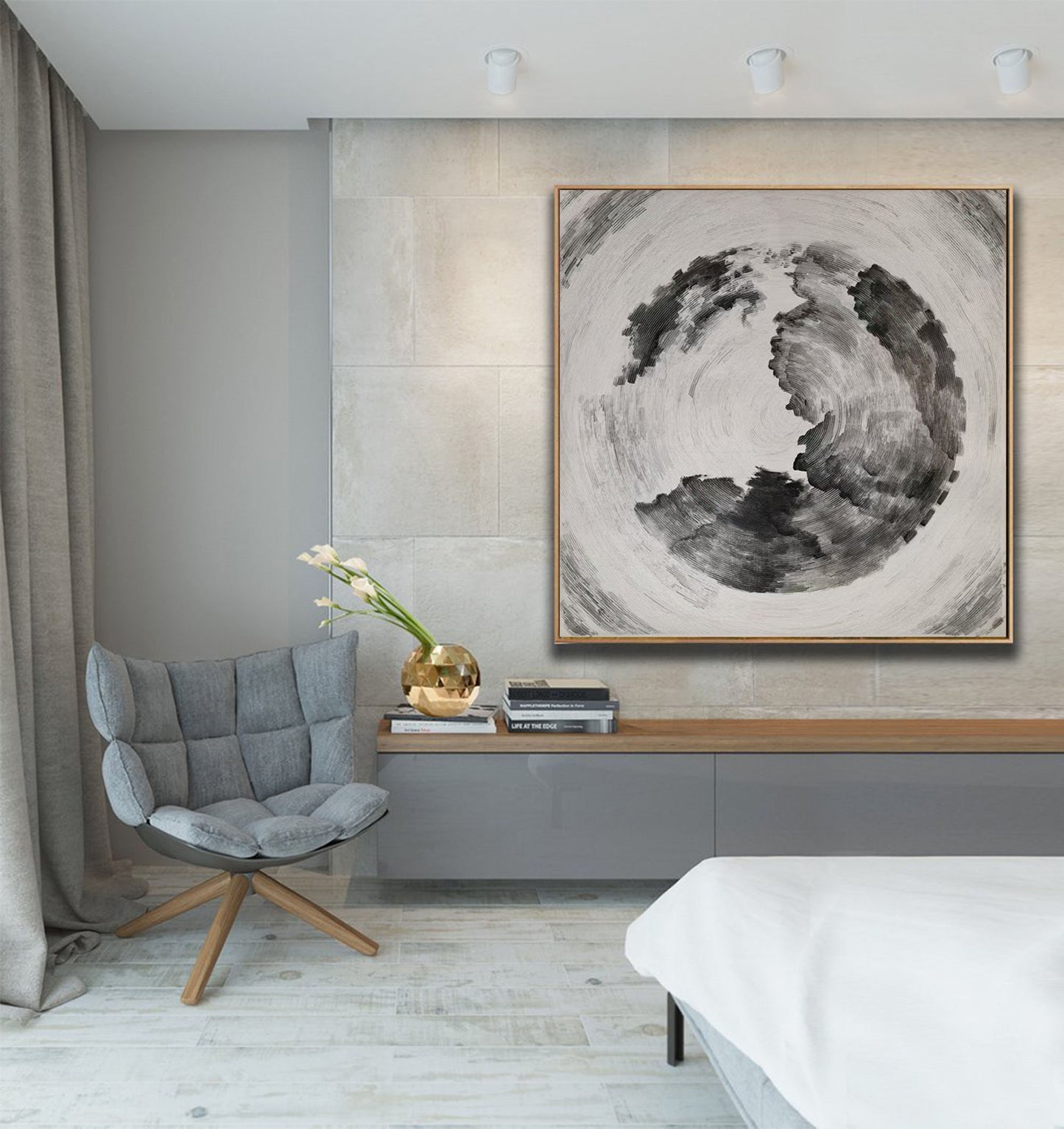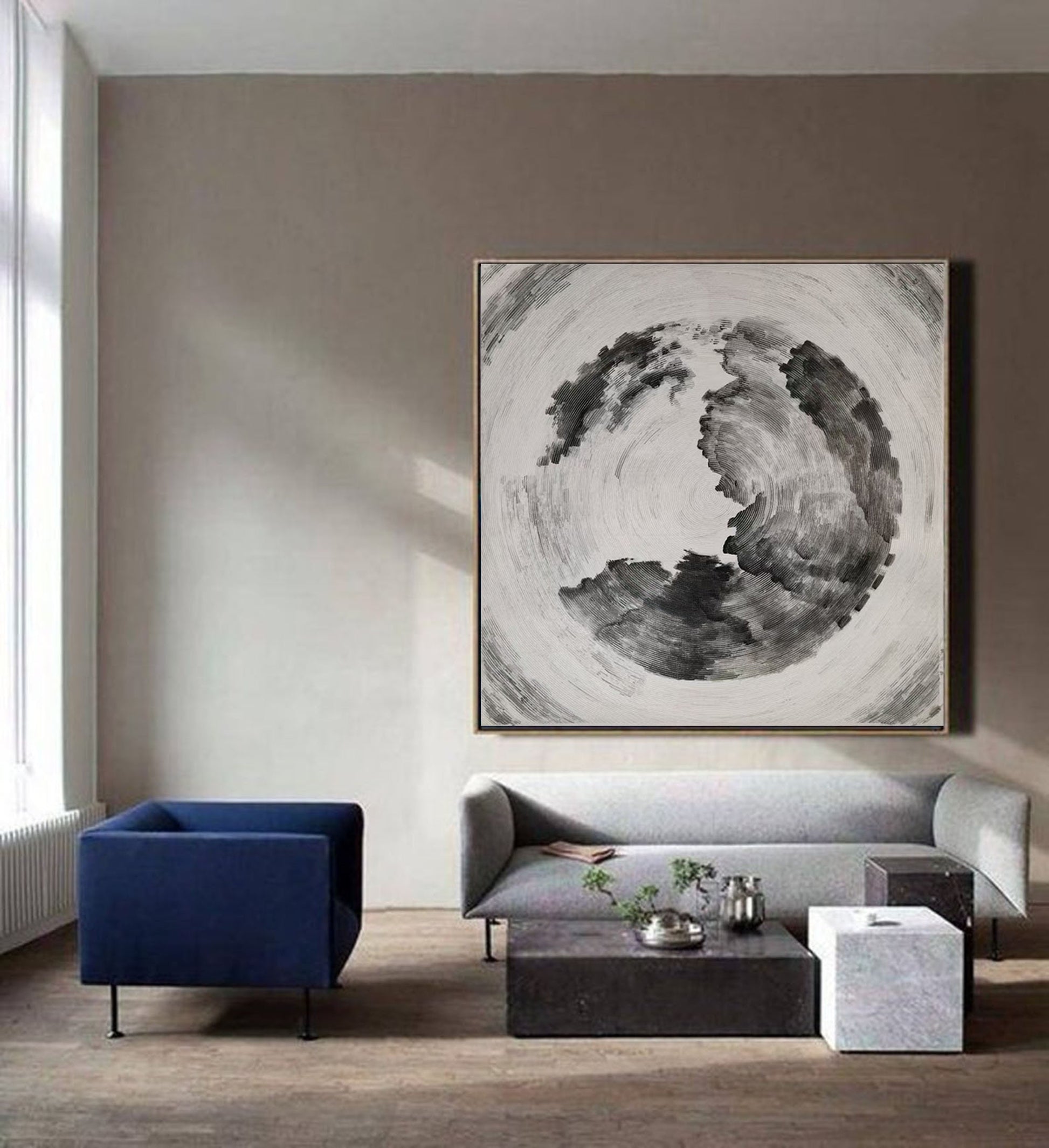 A bold yet refined expression of motion and form, this monochrome abstract swirl painting showcases rotating layers of black, grey, and white. The hand-painted circular brushwork creates a mesmerizing visual flow, evoking interpretations of energy, planetary movement, or time. Ideal for modern, minimalist, and monochromatic spaces, this textured canvas adds depth, sophistication, and a strong contemporary statement to any interior. A perfect focal point for entryways, offices, or upscale living rooms.