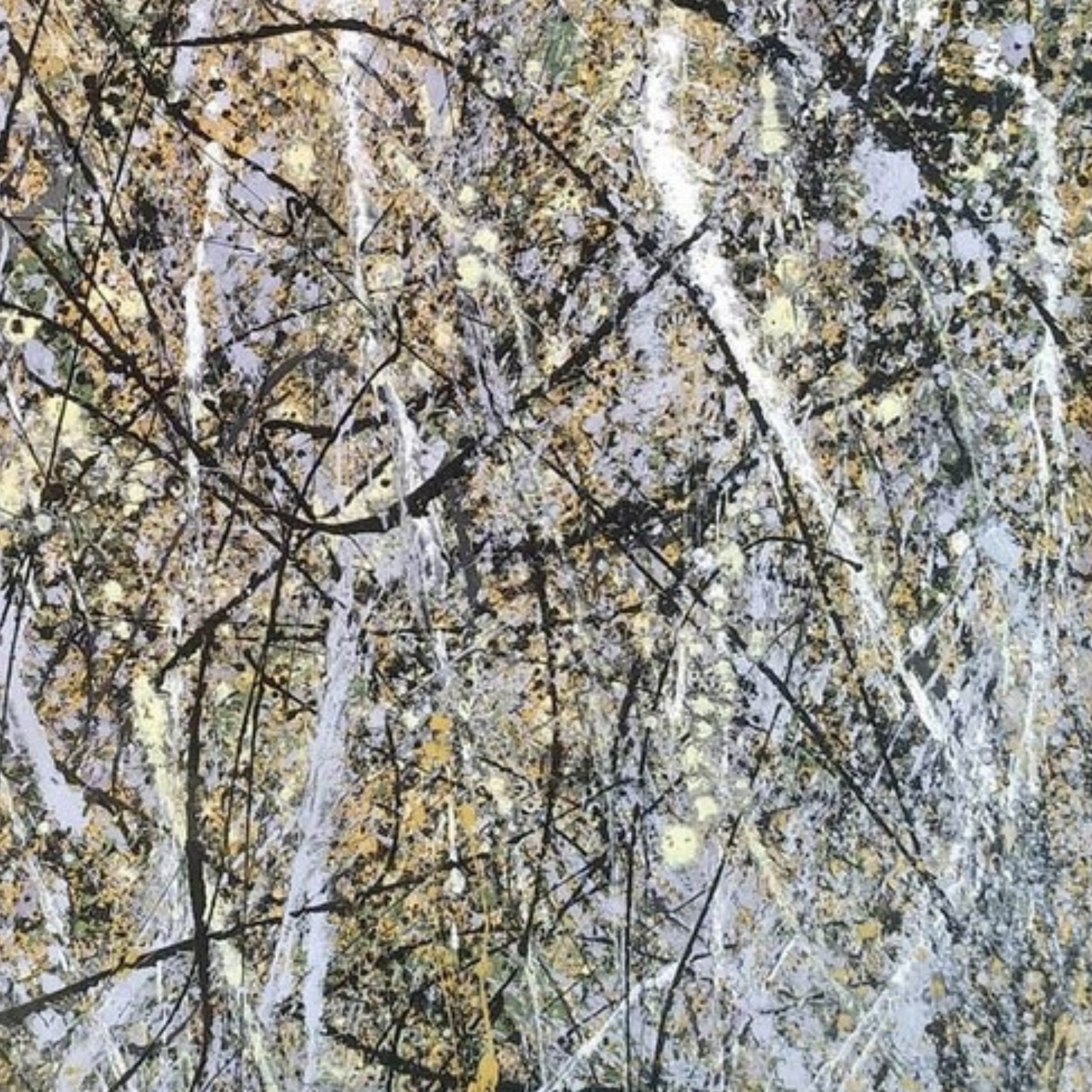 - Pollock-inspired drip painting with metallic gold, black, and white contrasts.