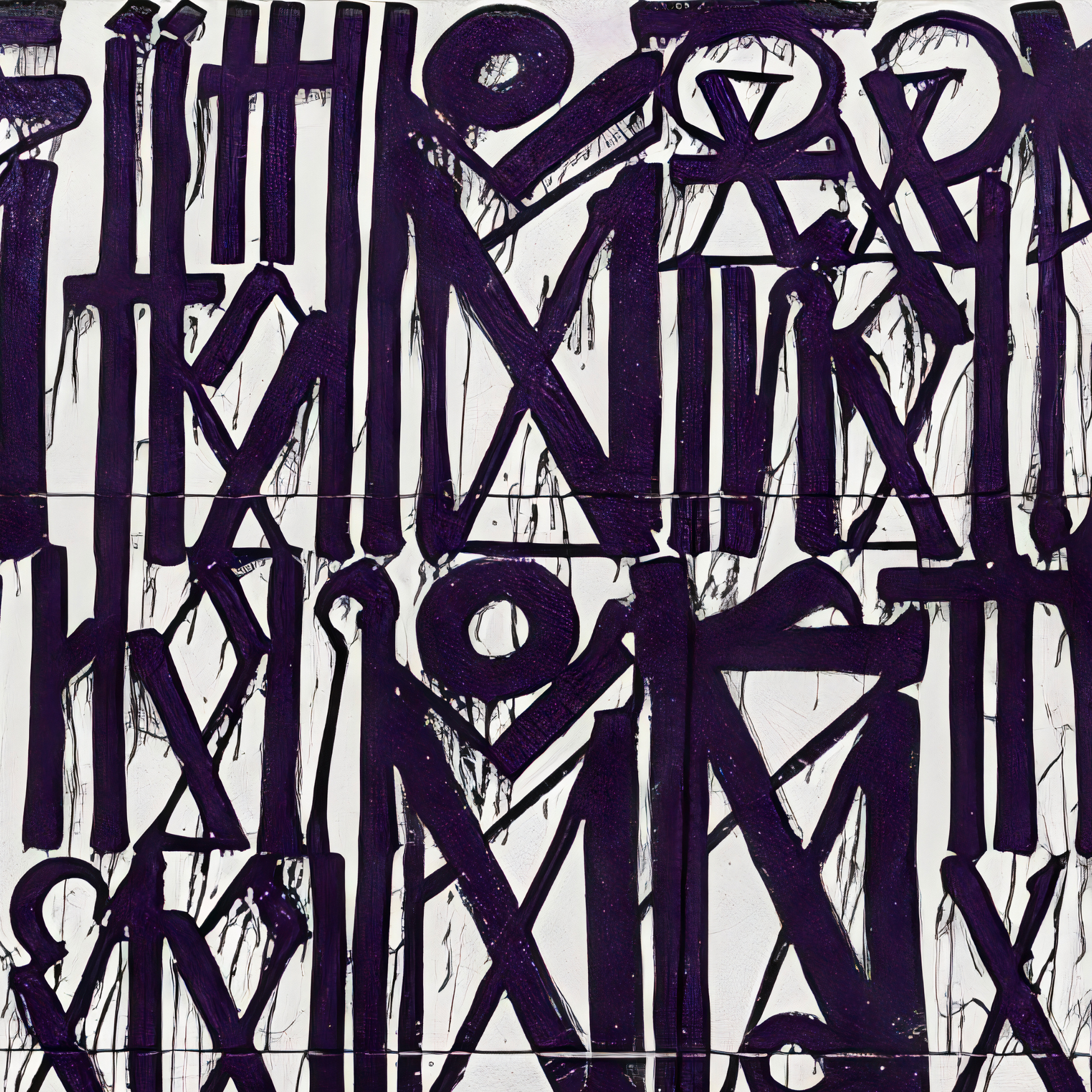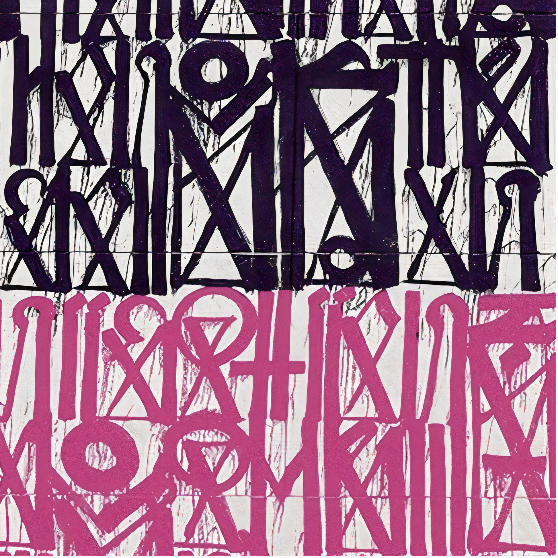 - RETNA-style abstract calligraphy in a dramatic purple, pink & white palette.