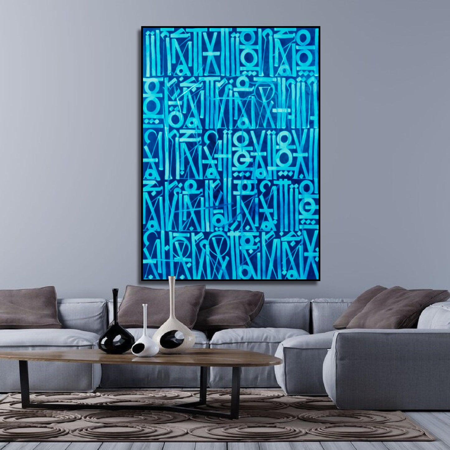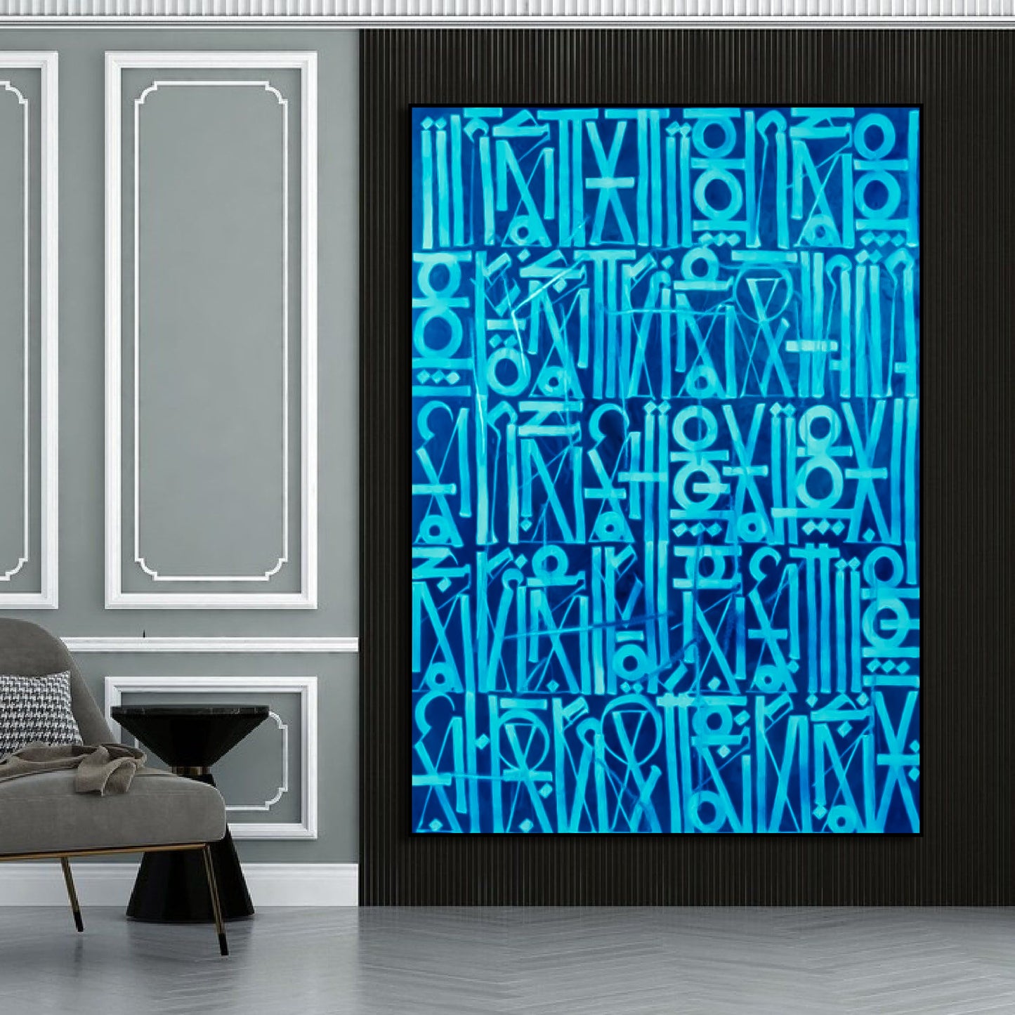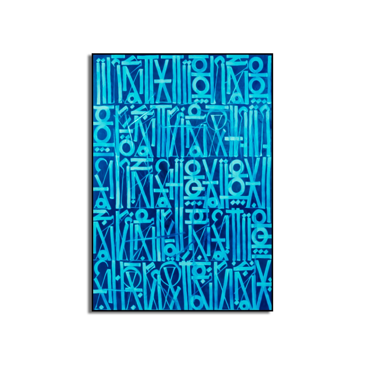 Cool, immersive, and rhythmically structured. This two-tone blue artwork takes cues from RETNA’s distinctive visual language—blending ancient script influences with contemporary urban energy. Layers of blue wash and crisp letter-forms create depth and movement, delivering a museum-worthy centrepiece for modern spaces. Each canvas is handcrafted by skilled artists, so subtle variations make every piece one of a kind.