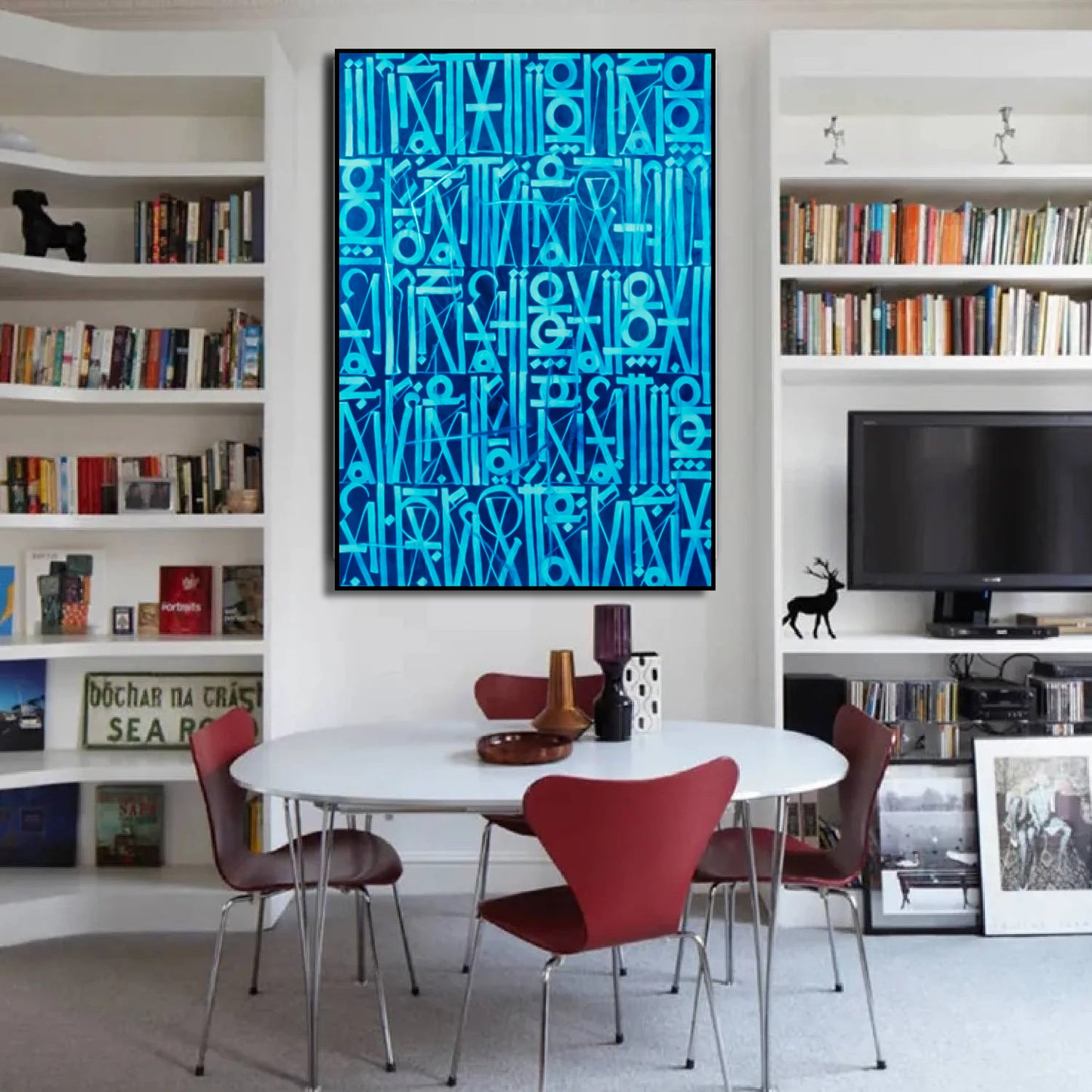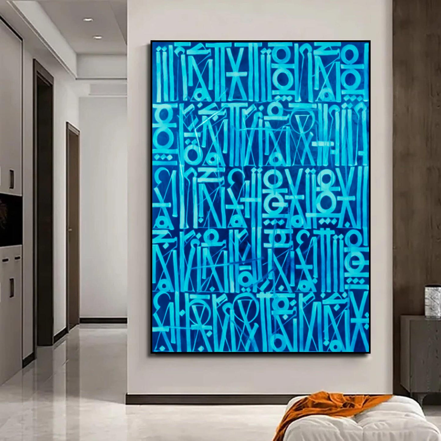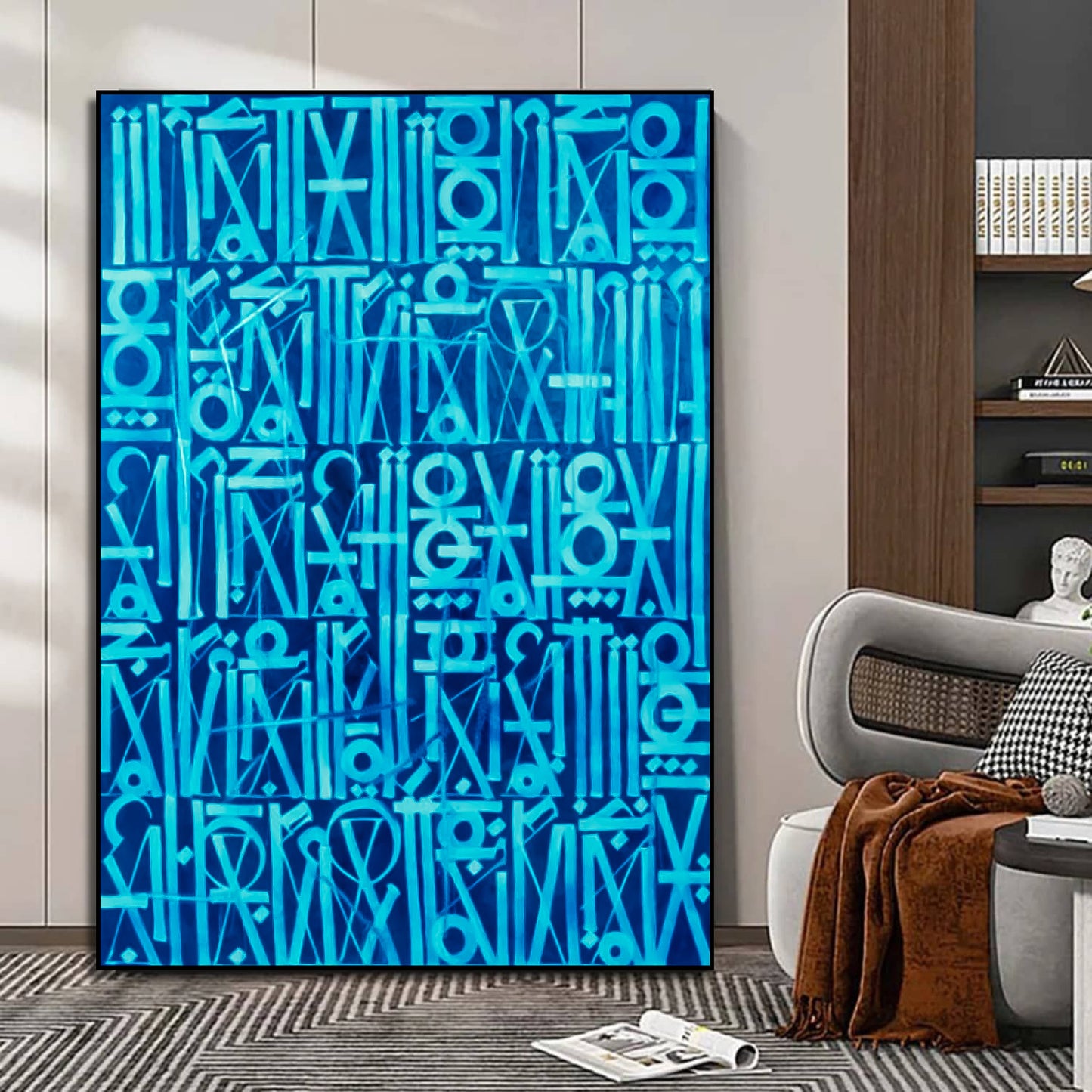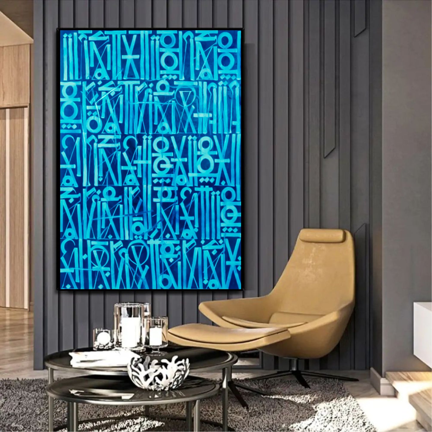 Cool, immersive, and rhythmically structured. This two-tone blue artwork takes cues from RETNA’s distinctive visual language—blending ancient script influences with contemporary urban energy. Layers of blue wash and crisp letter-forms create depth and movement, delivering a museum-worthy centrepiece for modern spaces. Each canvas is handcrafted by skilled artists, so subtle variations make every piece one of a kind.