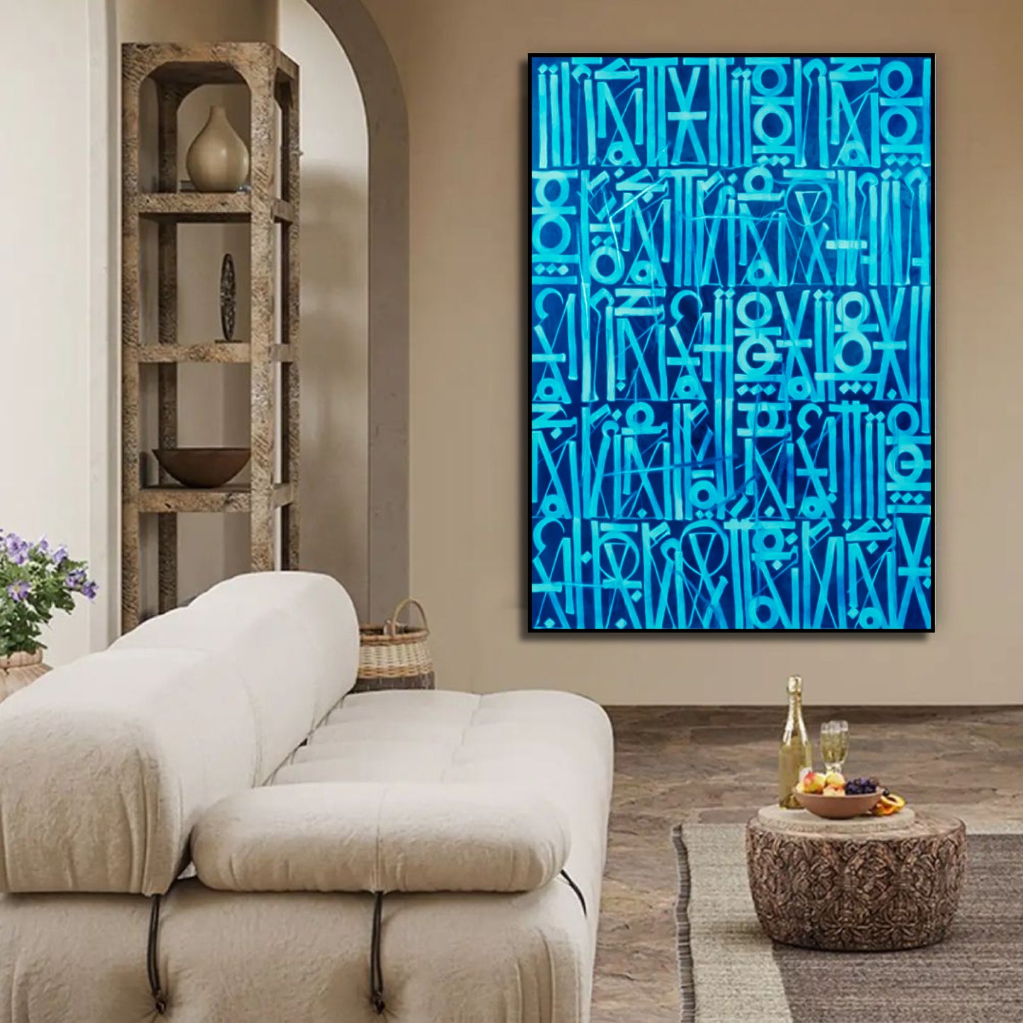 Two-Tone Blue RETNA-Inspired Abstract Script Painting – Handcrafted Canvas