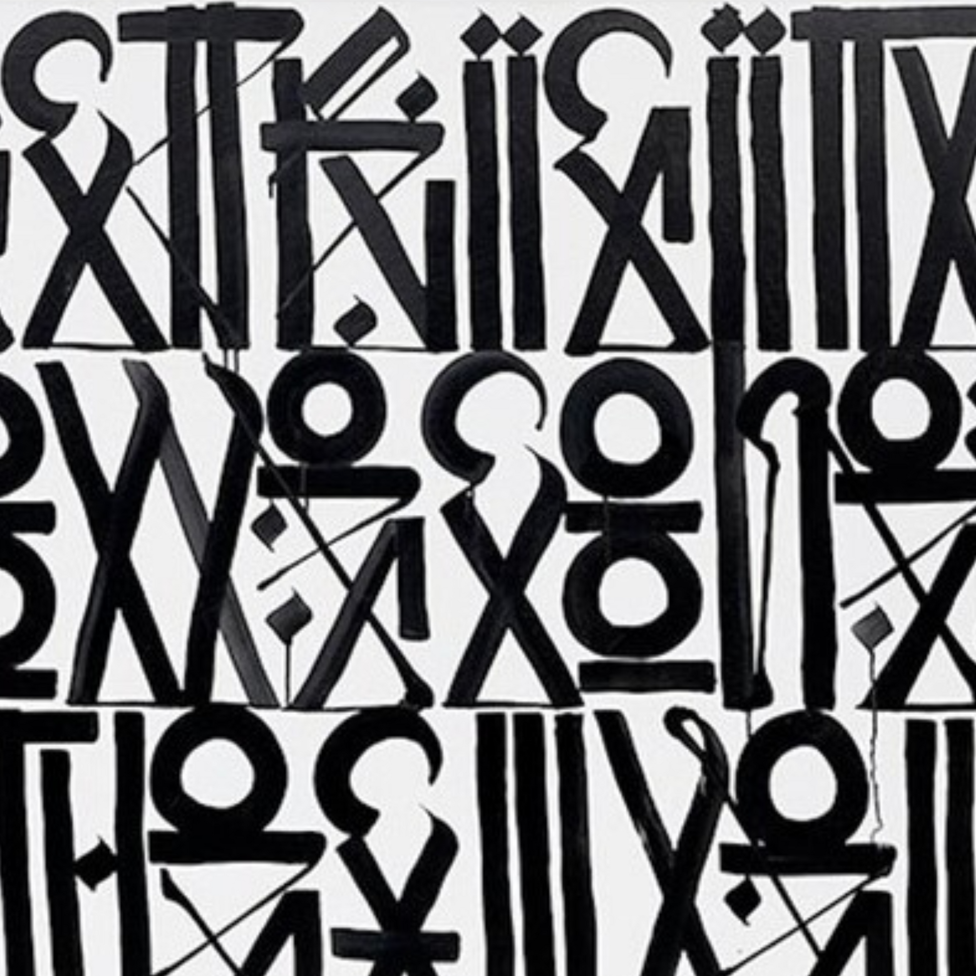 - RETNA-inspired monochrome abstract calligraphy with strong graphic impact.