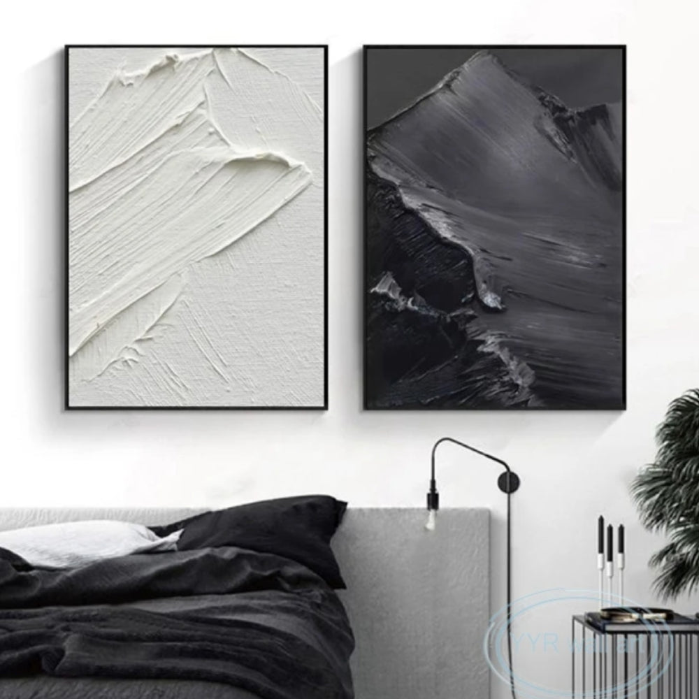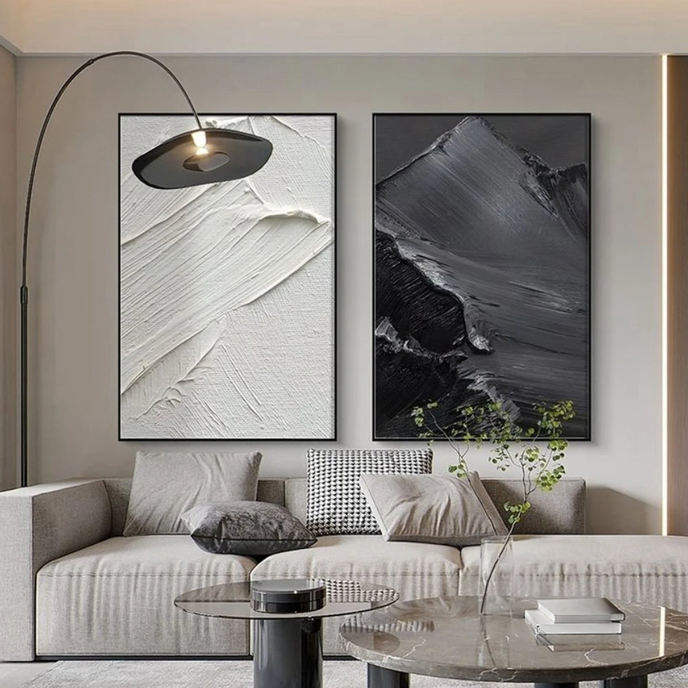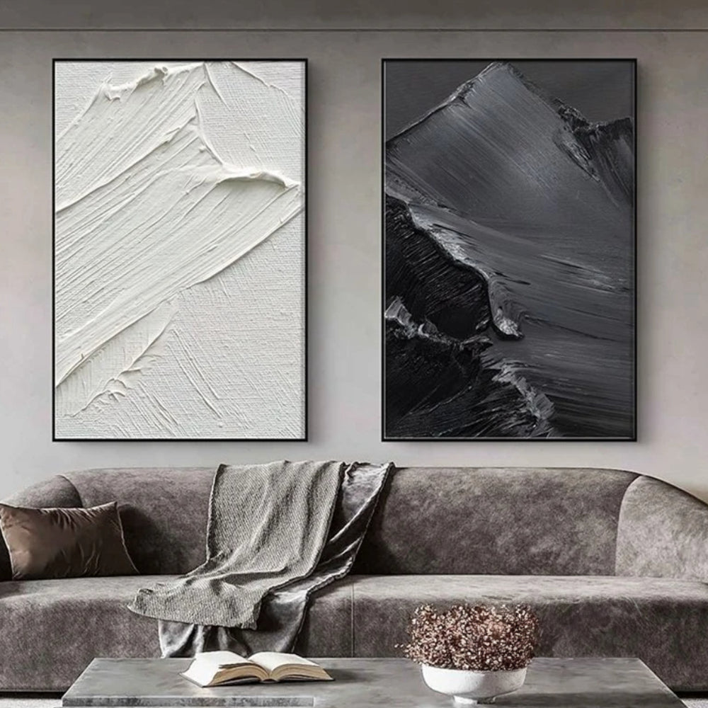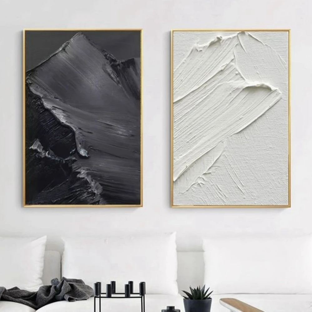 This captivating set of two oil paintings is a stunning addition to any home decor. The artwork features contrasting peaks in white and black, symbolizing the dualities of nature and life. The monochromatic palette adds a modern, minimalist touch, while the expressive brushwork brings a sense of movement and dynamism.