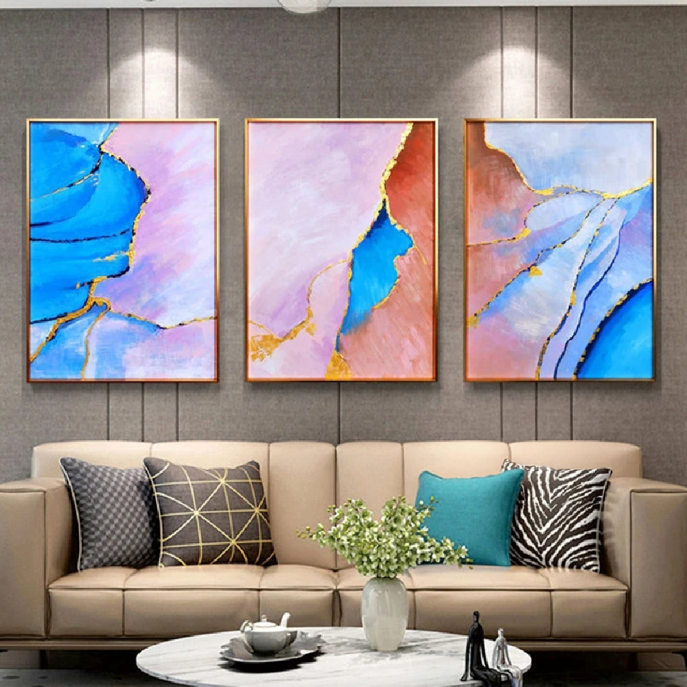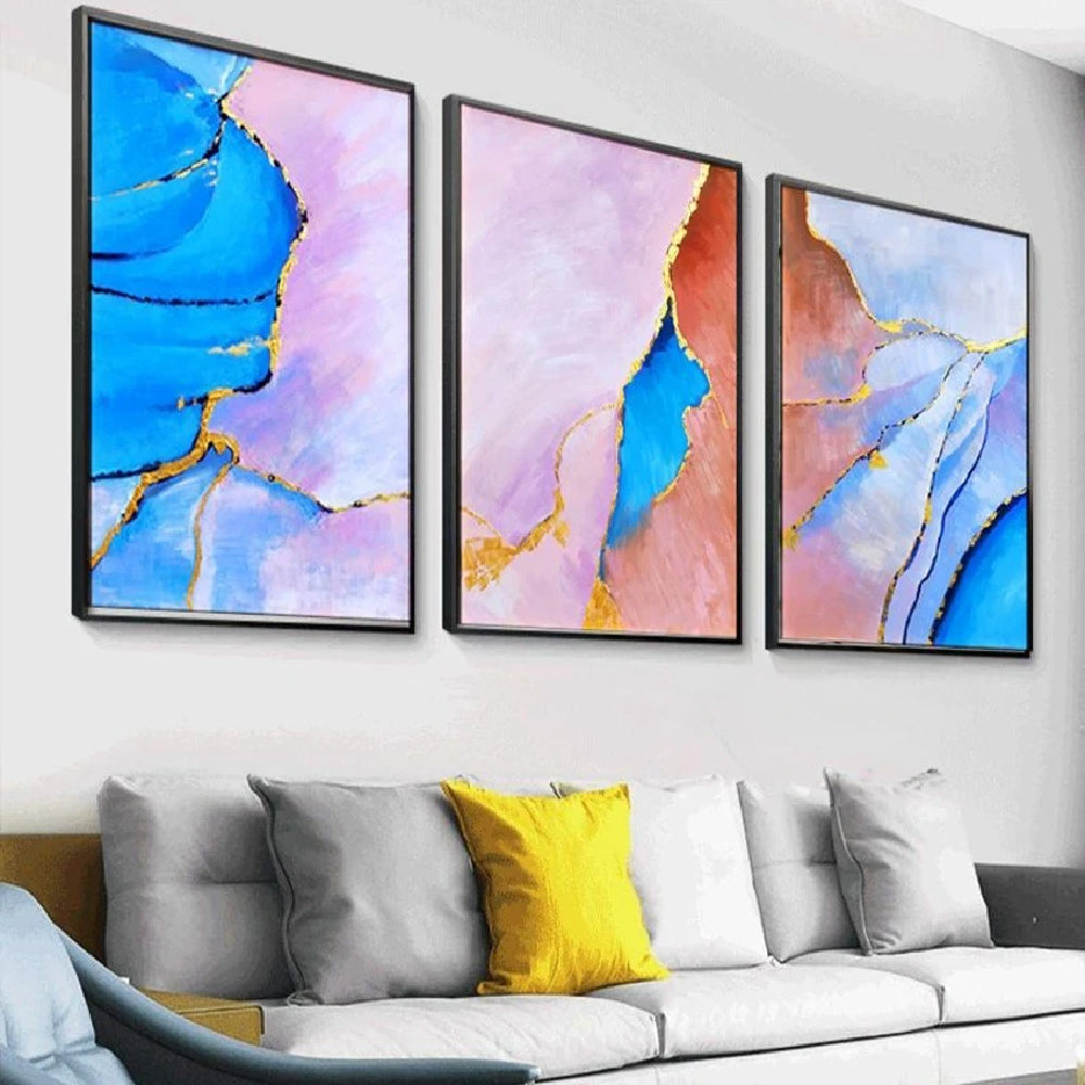 The painting features a striking line that elegantly divides the canvas into vibrant multicoloured sections. Each panel is a riot of colours, with bold strokes and splashes of colour paint creating a dynamic visual effect. The colour adds a touch of luxury and sophistication, serving as a unifying element across the three panels. This abstract oil painting is a celebration of colour and form, making it a stunning addition to any art collection.