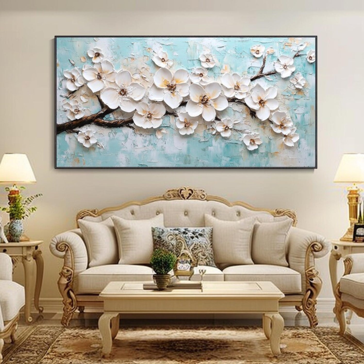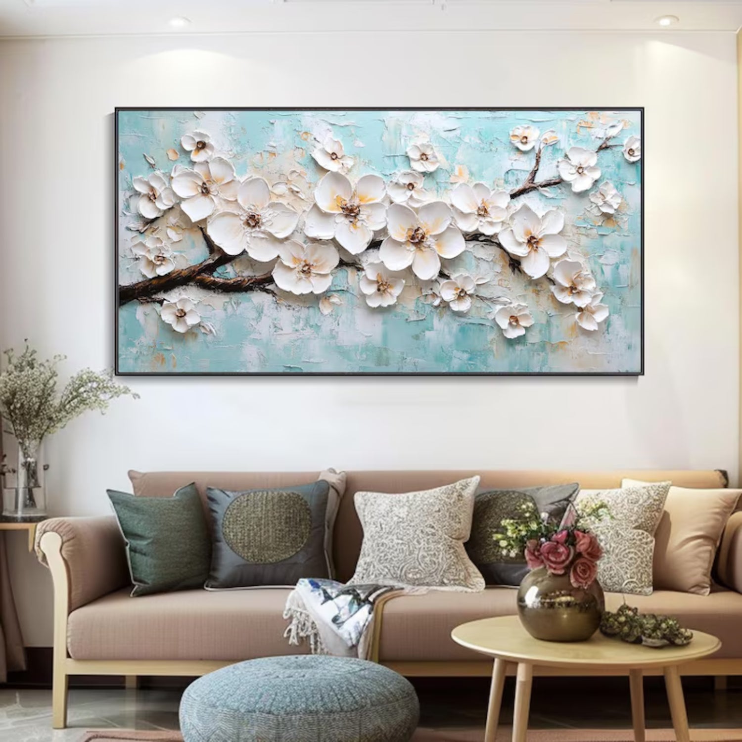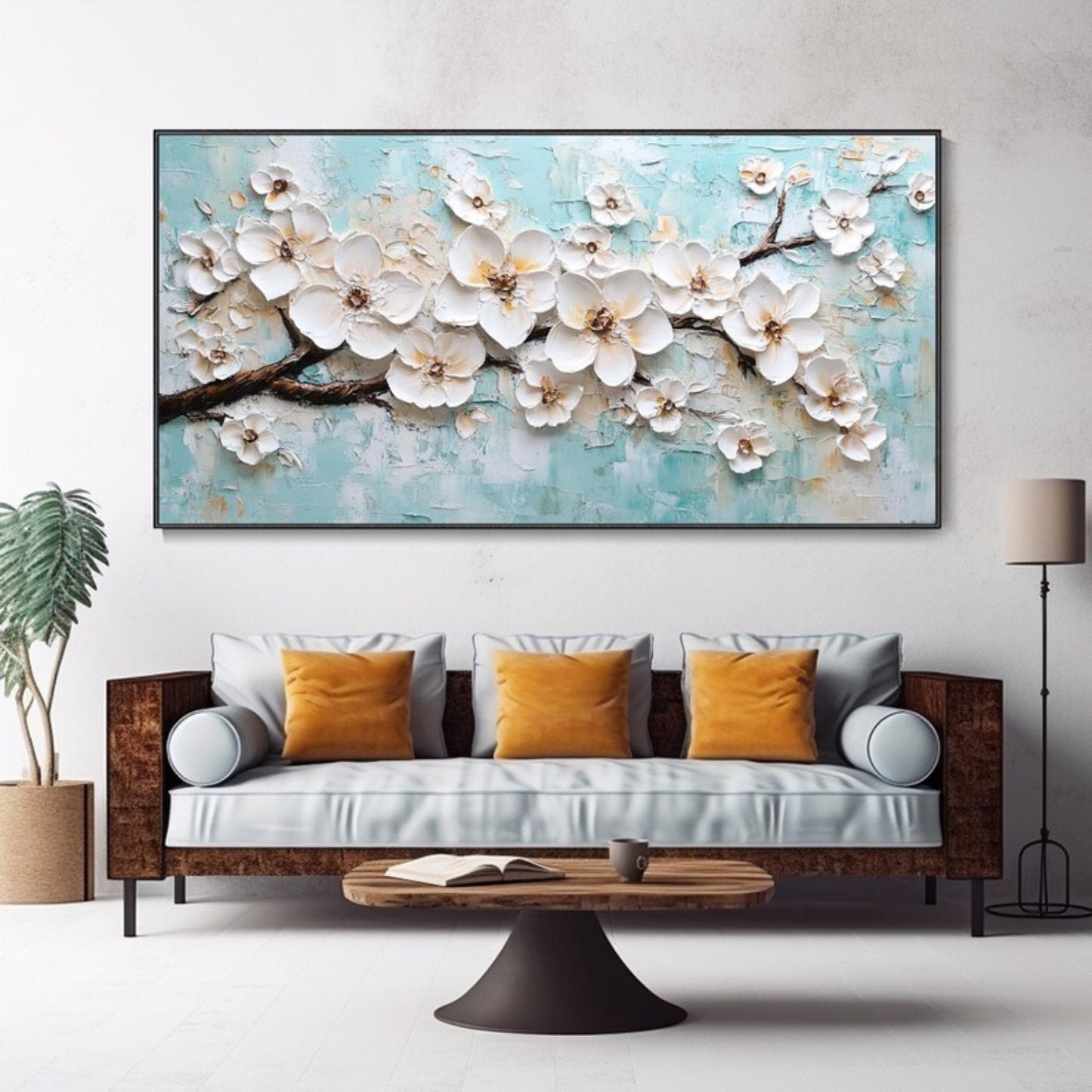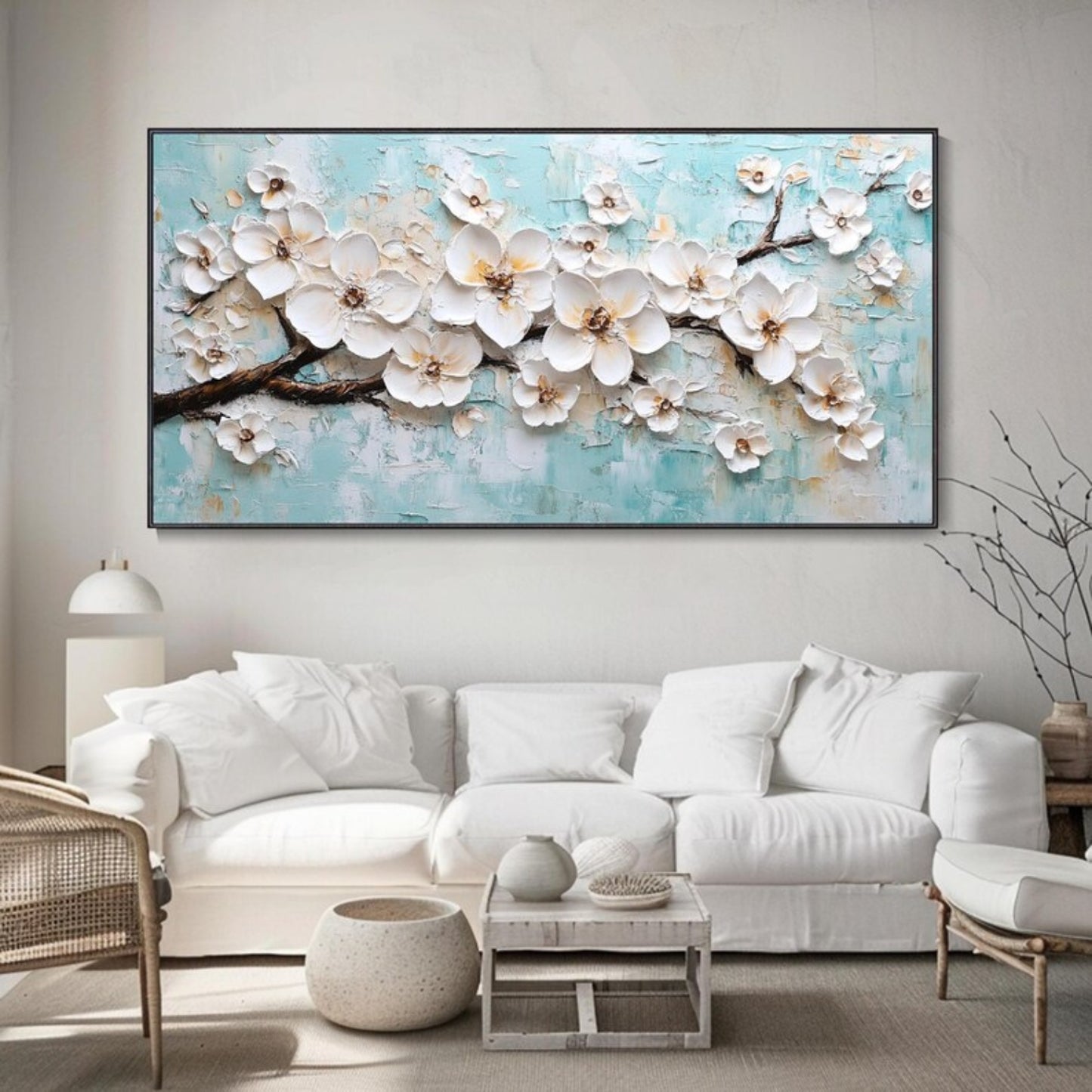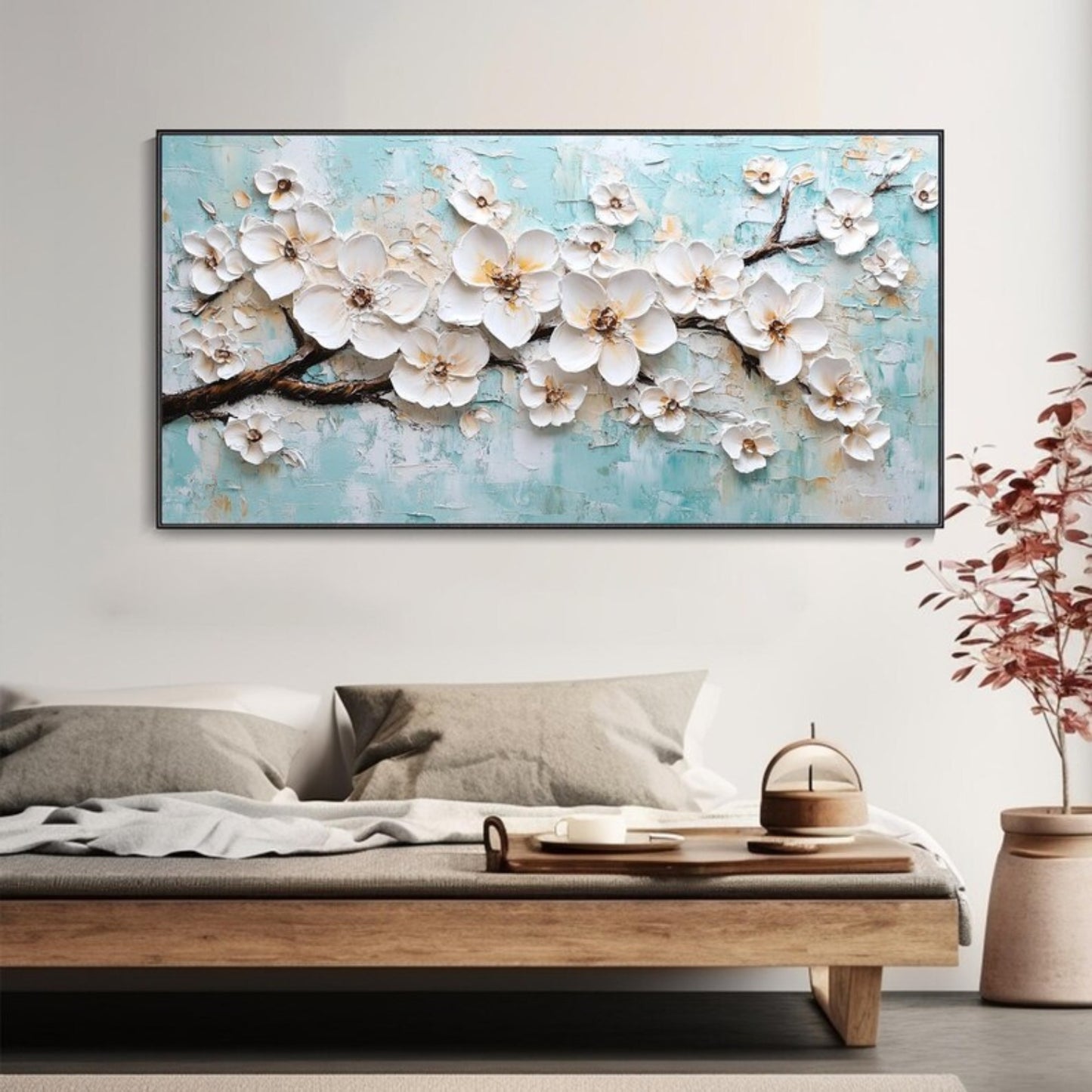 Spring Bloom Symphony is a refined impasto floral painting that brings nature's grace to your space with sculptural detail and soothing tones. Crafted with palette knife strokes, delicate white blossoms bloom along a rich chocolate brown branch, rising across a serene teal, ivory, and mint-toned background. Subtle accents of soft gold add shimmer and warmth to the composition, while the raised petals and bark create a striking 3D effect. A calming, elegant piece perfect for brightening bedrooms, hallways, or contemporary living rooms with botanical charm..