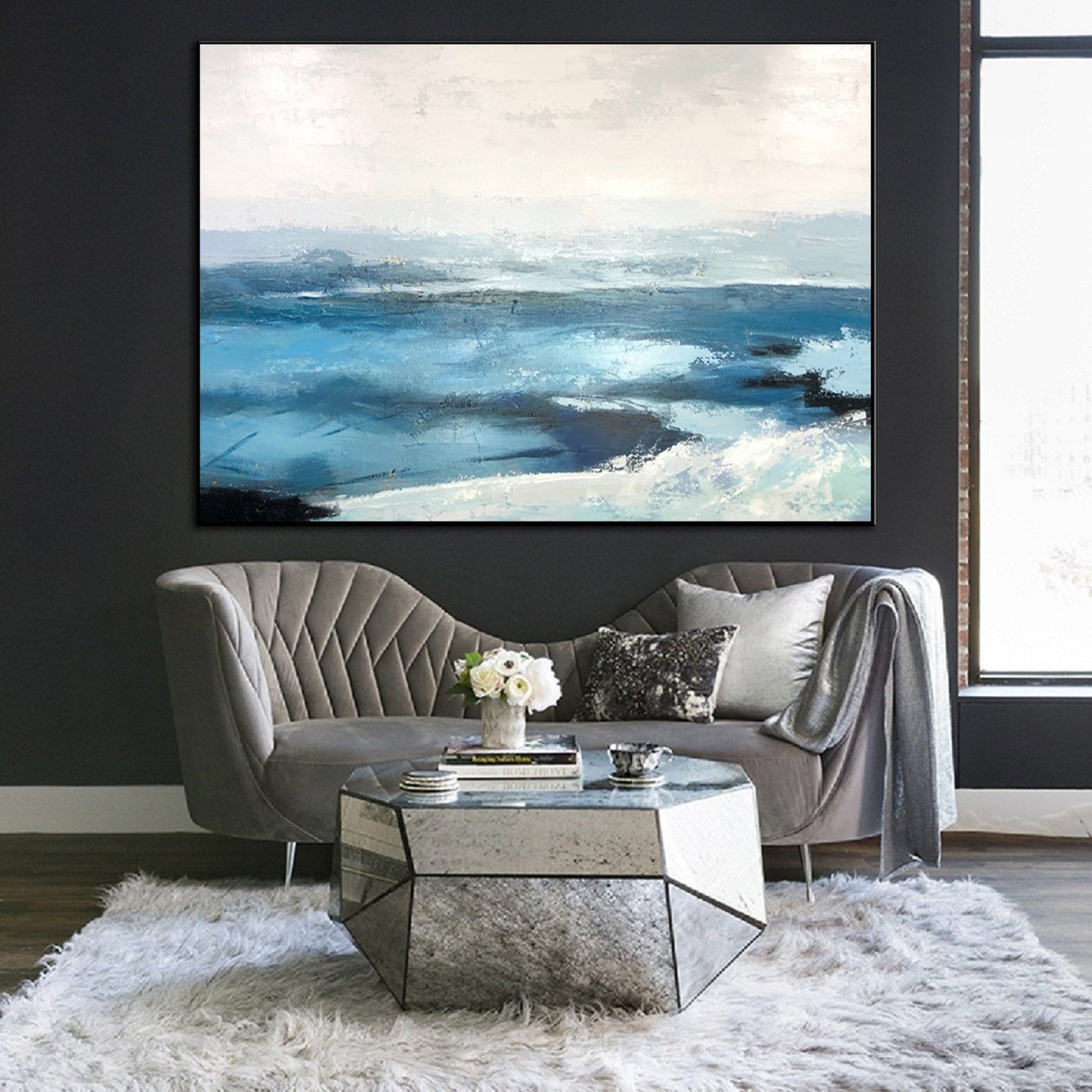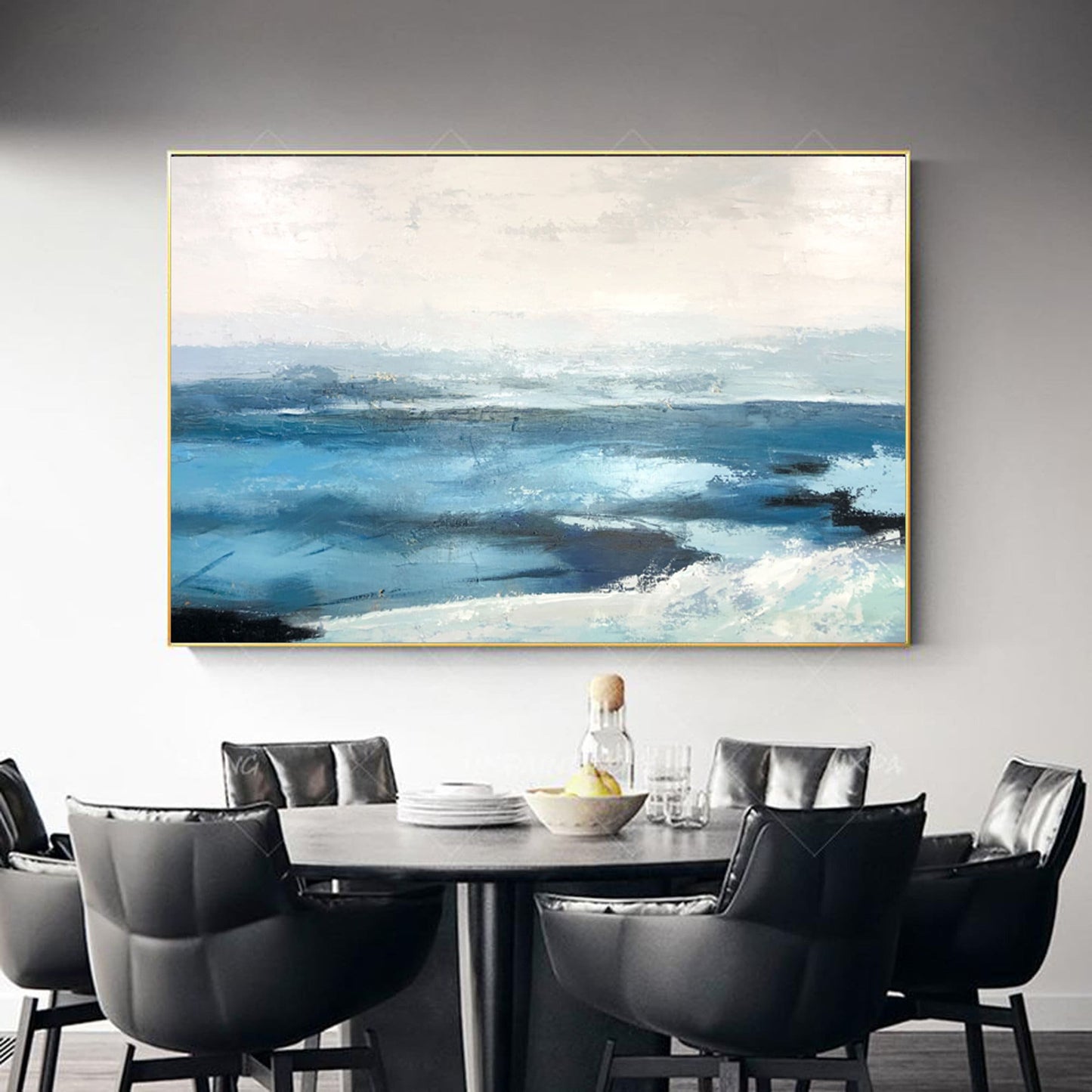 Bring coastal serenity into your home with this stunning abstract blue seascape painting. Hand-painted with textured layers of navy, aqua, cerulean, and white, the artwork captures the movement and tranquility of ocean waves meeting the horizon. The rich brush and palette knife strokes create a sense of depth and motion, while the soft gradients add light and calmness. Ideal for beach-inspired homes, modern living rooms, or minimalist spaces seeking a soothing focal point, this canvas brings timeless coastal charm and modern elegance to any interior.