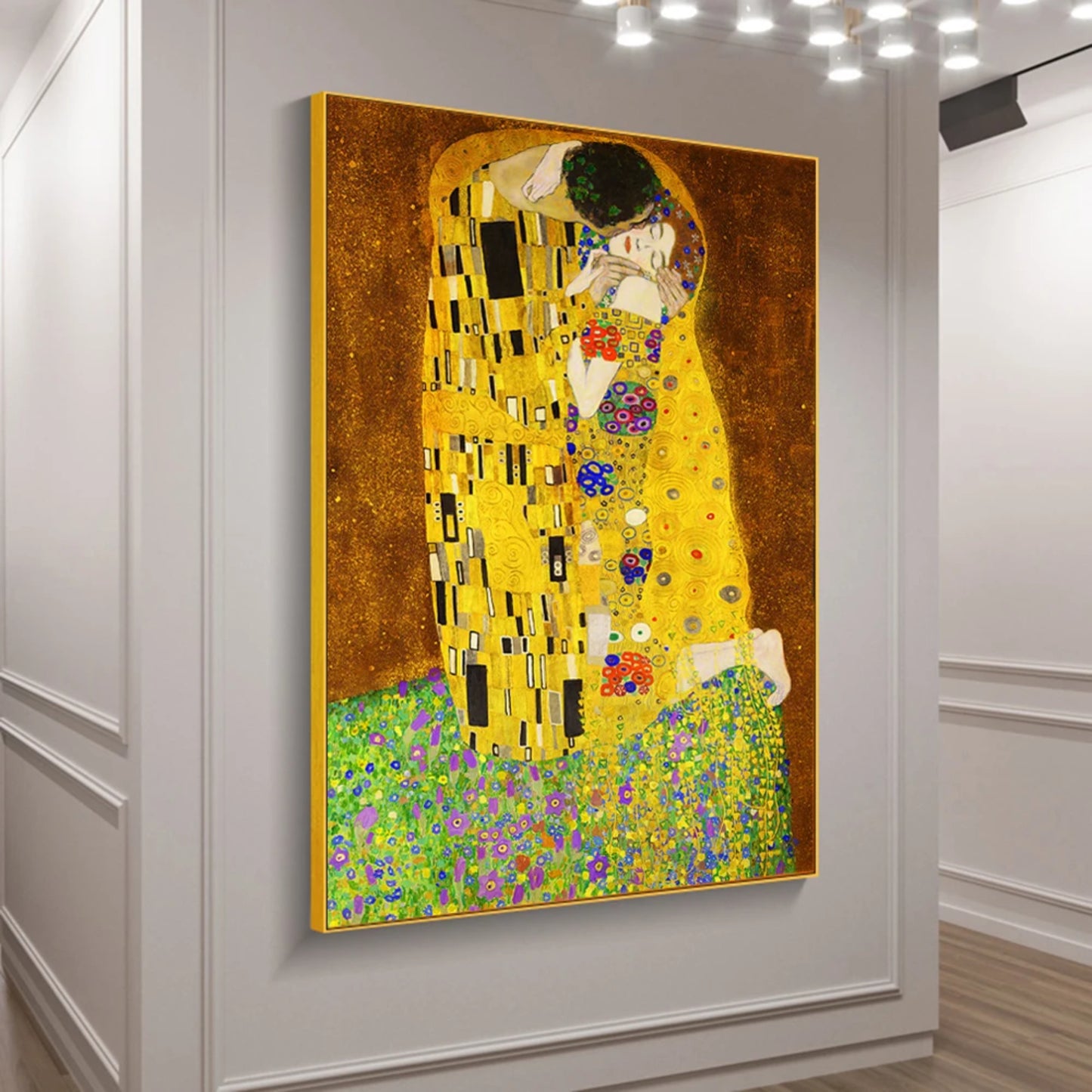 This stunning handmade oil and acrylic reproduction of The Kiss by Gustav Klimt captures the romantic intimacy and golden opulence of the original masterpiece. Painted entirely by hand by skilled artists, it features the intricate geometric patterns, vibrant floral base, and iconic embrace that made this work one of the most celebrated paintings in art history.