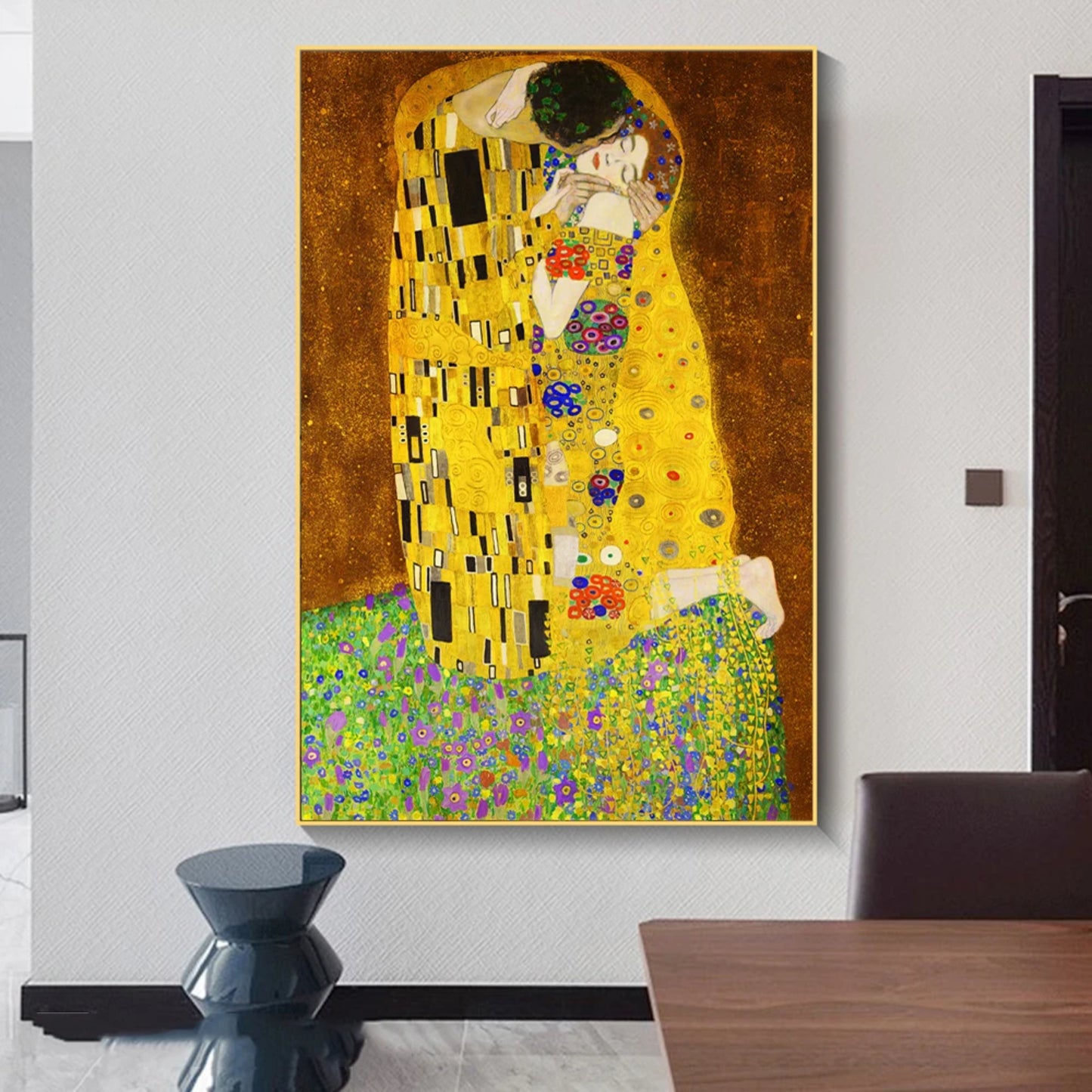 - Faithful handmade reproduction of Klimt’s world-famous The Kiss.