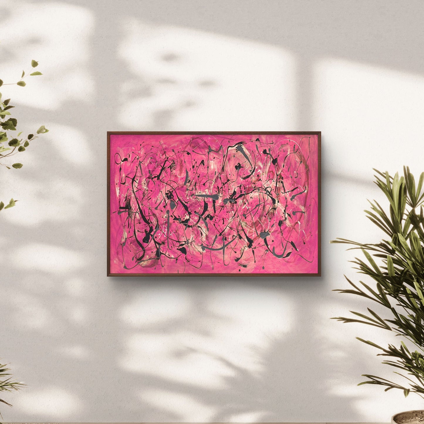 Playful, bold, and contemporary. This hand-painted, Pollock-inspired canvas sets a vibrant hot-pink ground alive with sweeping black pours and soft white highlights. Layered action-painting creates rhythm and depth, delivering a striking centrepiece for living rooms, studios, and gallery-style spaces. Each artwork is crafted by hand for tactile texture and one-of-a-kind character.