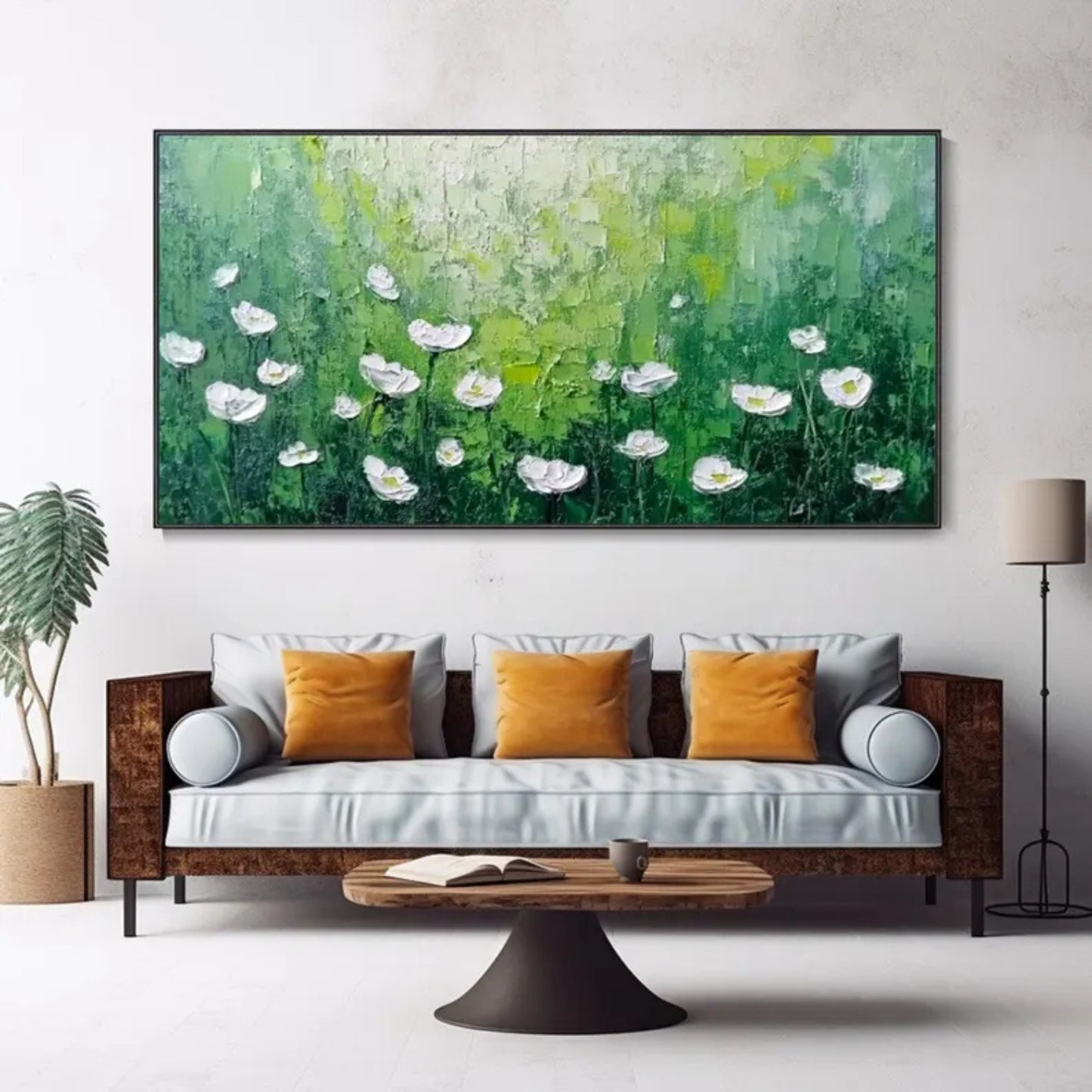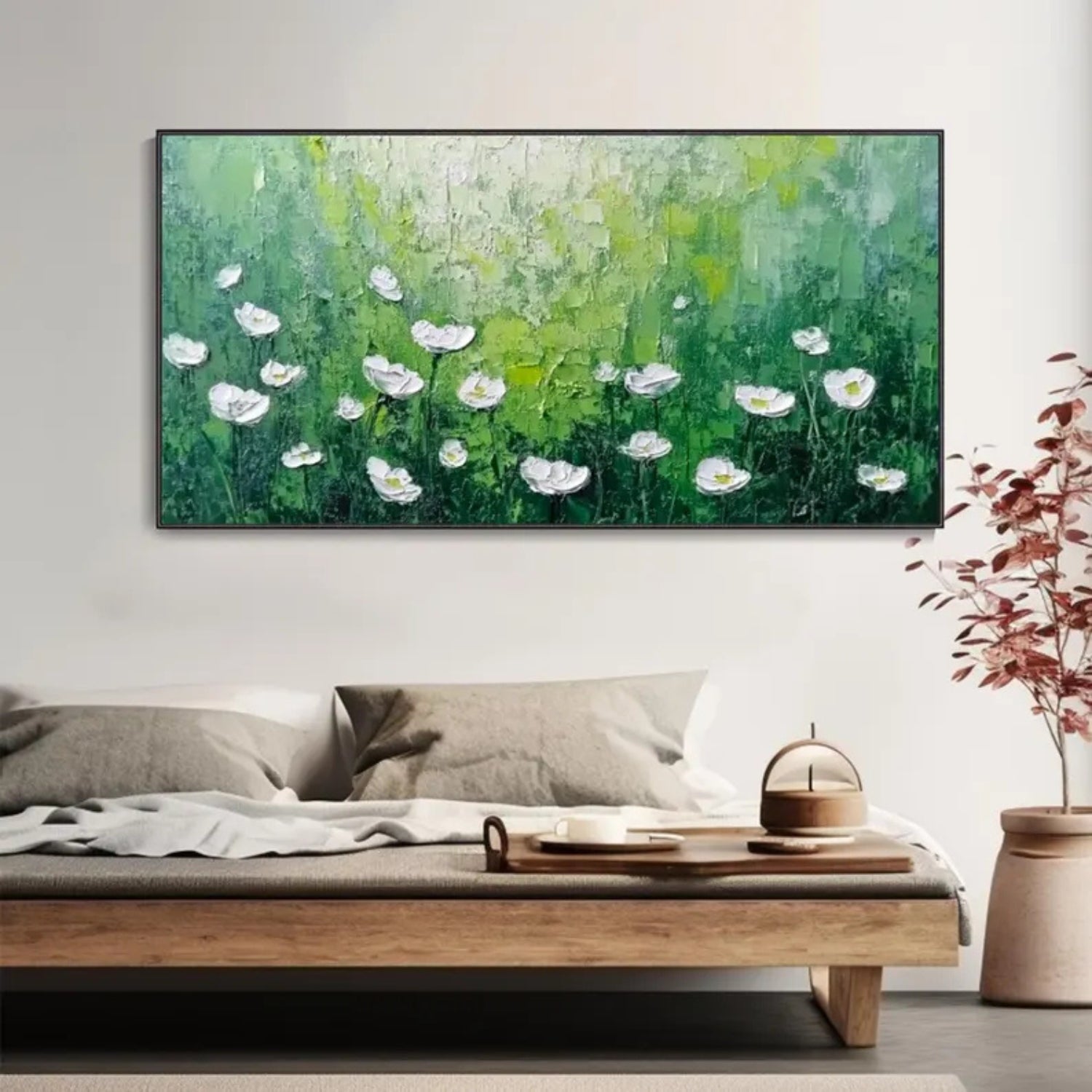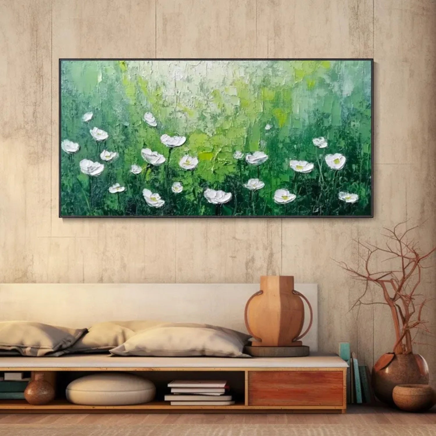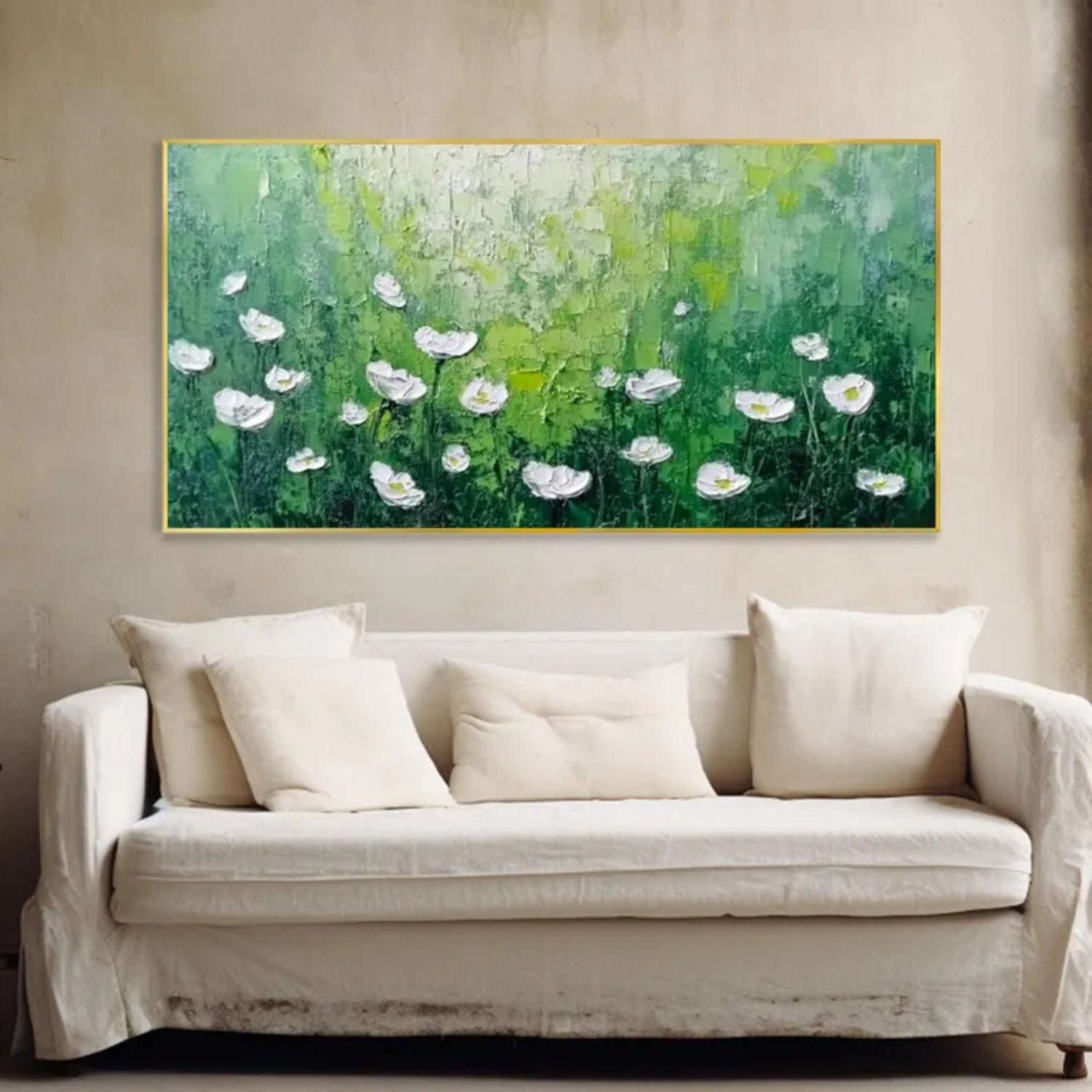 Whispers in Green is a tranquil impasto floral painting that evokes the quiet magic of a sunlit meadow. Thick palette knife strokes sculpt delicate white blossoms that float across a richly textured field of layered greens—from mint and sage to emerald, moss, and deep forest tones. The soft movement of the petals contrasts beautifully with the tactile, gradient backdrop, adding serene energy and organic depth to any space. A peaceful, nature-inspired piece perfect for calming living areas, bedrooms, or entryways.