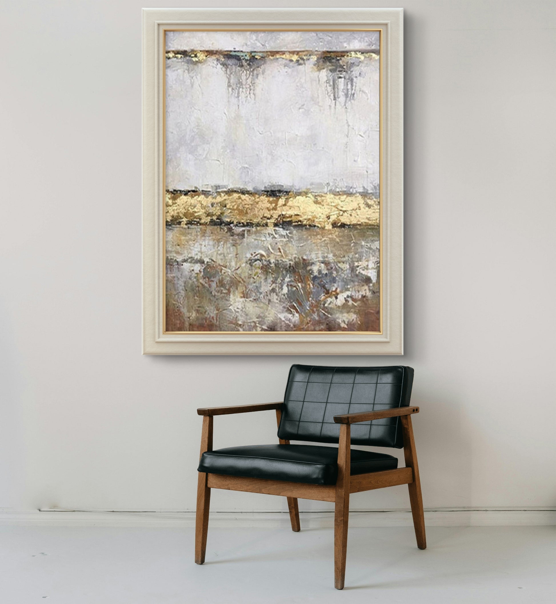 The Golden River 100% Hand-Painted Minimalist Painting features flowing metallic textures and soft neutral tones, creating a serene and luxurious focal point for modern interiors. Its palette of gold, white, and warm beige brings an elegant glow to living rooms, bedrooms, offices, and hotel-style spaces.