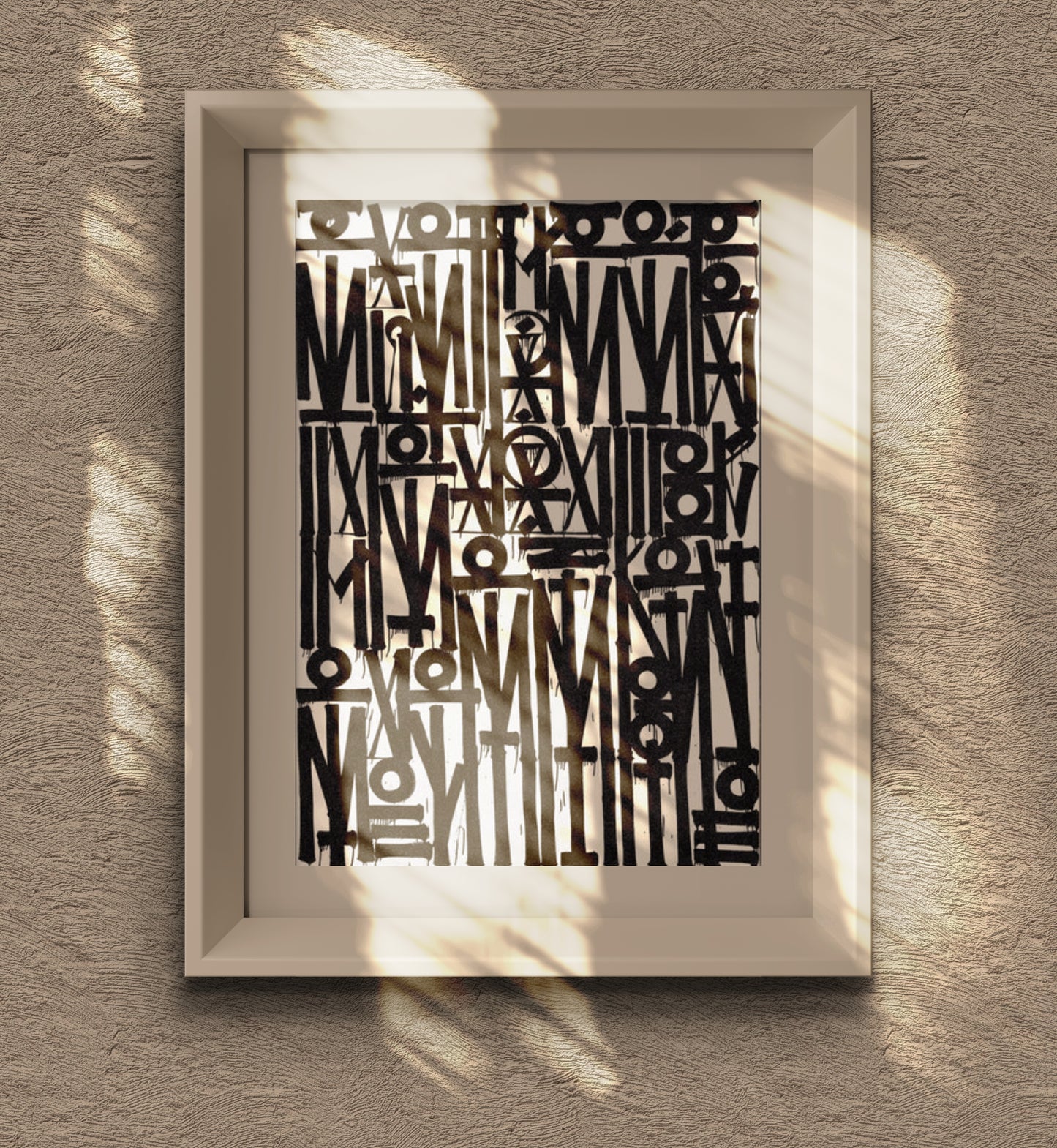 Graphic, minimalist, and powerfully urban. This RETNA-inspired canvas layers crisp white calligraphic symbols over a deep black ground. The rhythmic grid of strokes, circles, and bars creates a bold street-meets-gallery aesthetic that anchors modern, minimalist, and industrial interiors. Each piece is meticulously hand-painted, giving you authentic texture and presence you can’t get from prints.