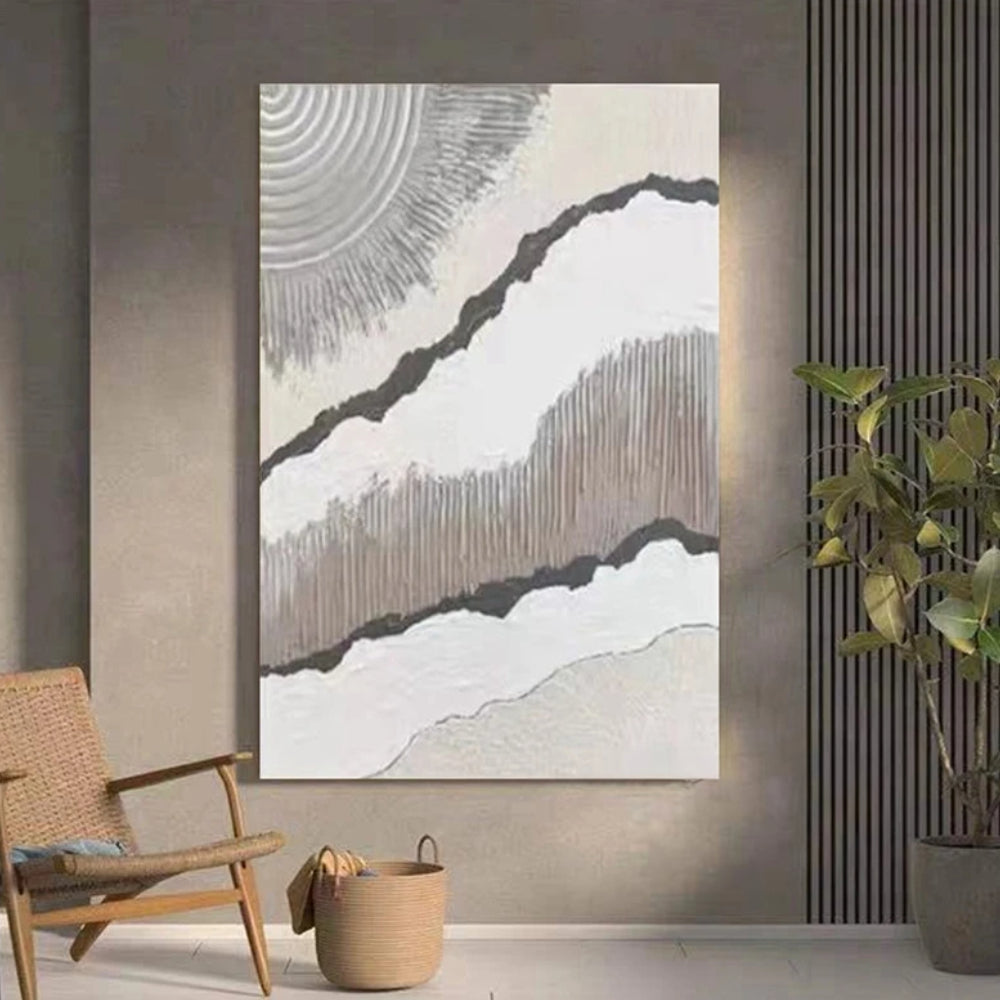 It features a mesmerizing pattern of rays, intricately woven together in a harmonious blend of brown and grey hues. The rays emanate from a central point, creating a sense of depth and movement that draws the viewer's eye inward. The brown tones bring a sense of warmth and earthiness to the piece, grounding it and making it a perfect fit for a living room setting. The grey tones, on the other hand, add a modern and sophisticated touch, enhancing the overall aesthetic appeal of the painting.