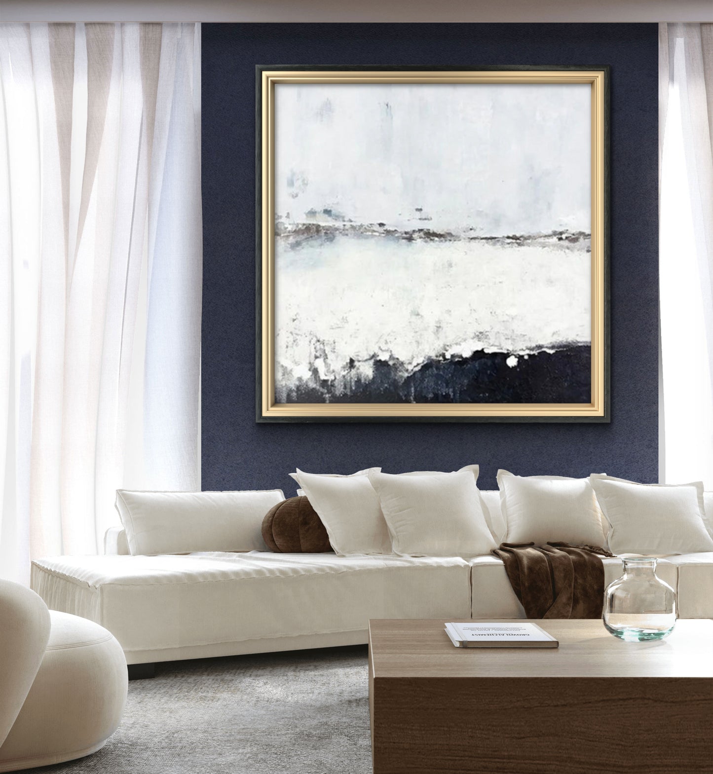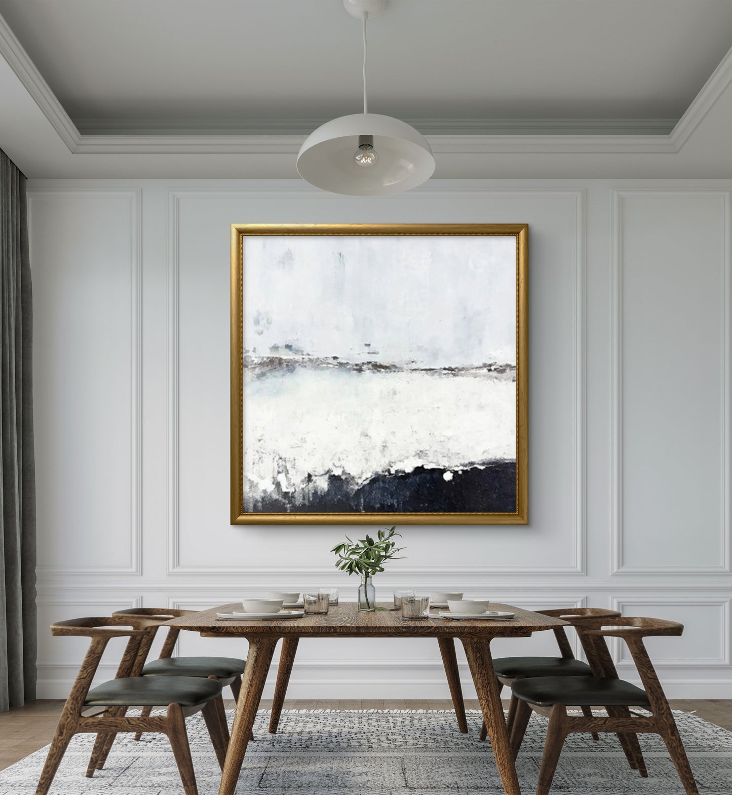 A minimalist monochromatic landscape textured painting is a striking work of art that combines the elegance of minimalism with the richness of texture. This type of painting typically features a serene and simplified landscape rendered in a single colour, often shades of black and white. What sets it apart is the meticulous attention to texture, as the artist employs various techniques to create depth and tactile appeal within the limited colour palette.