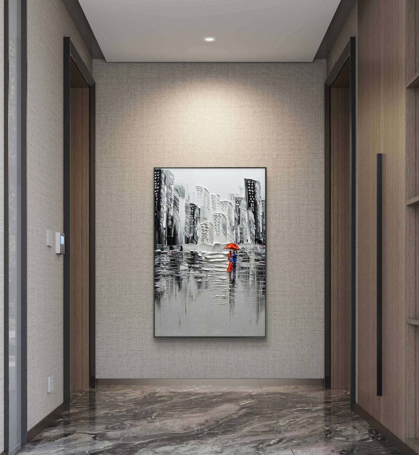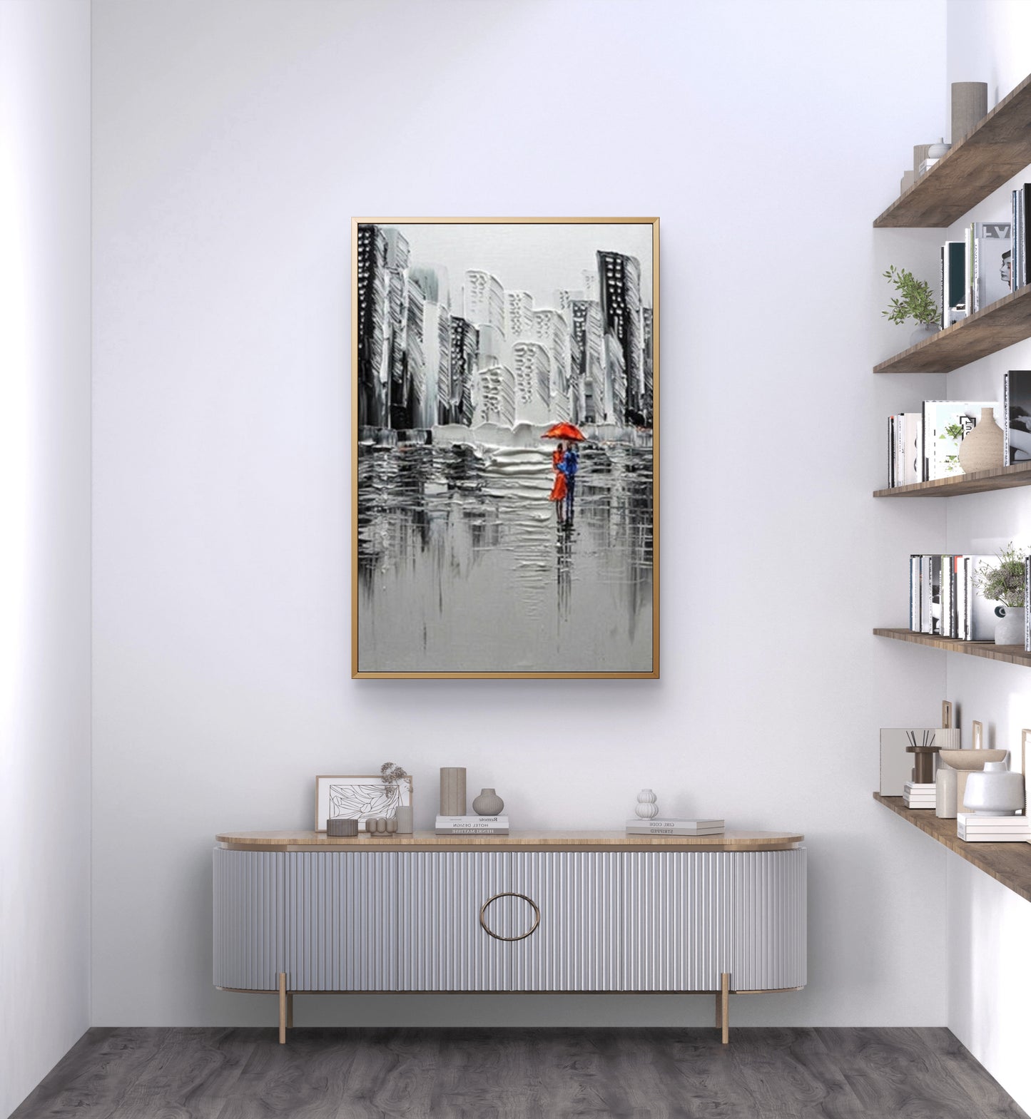 Walking Couple in Rain 100% Hand Painted Cityscape
